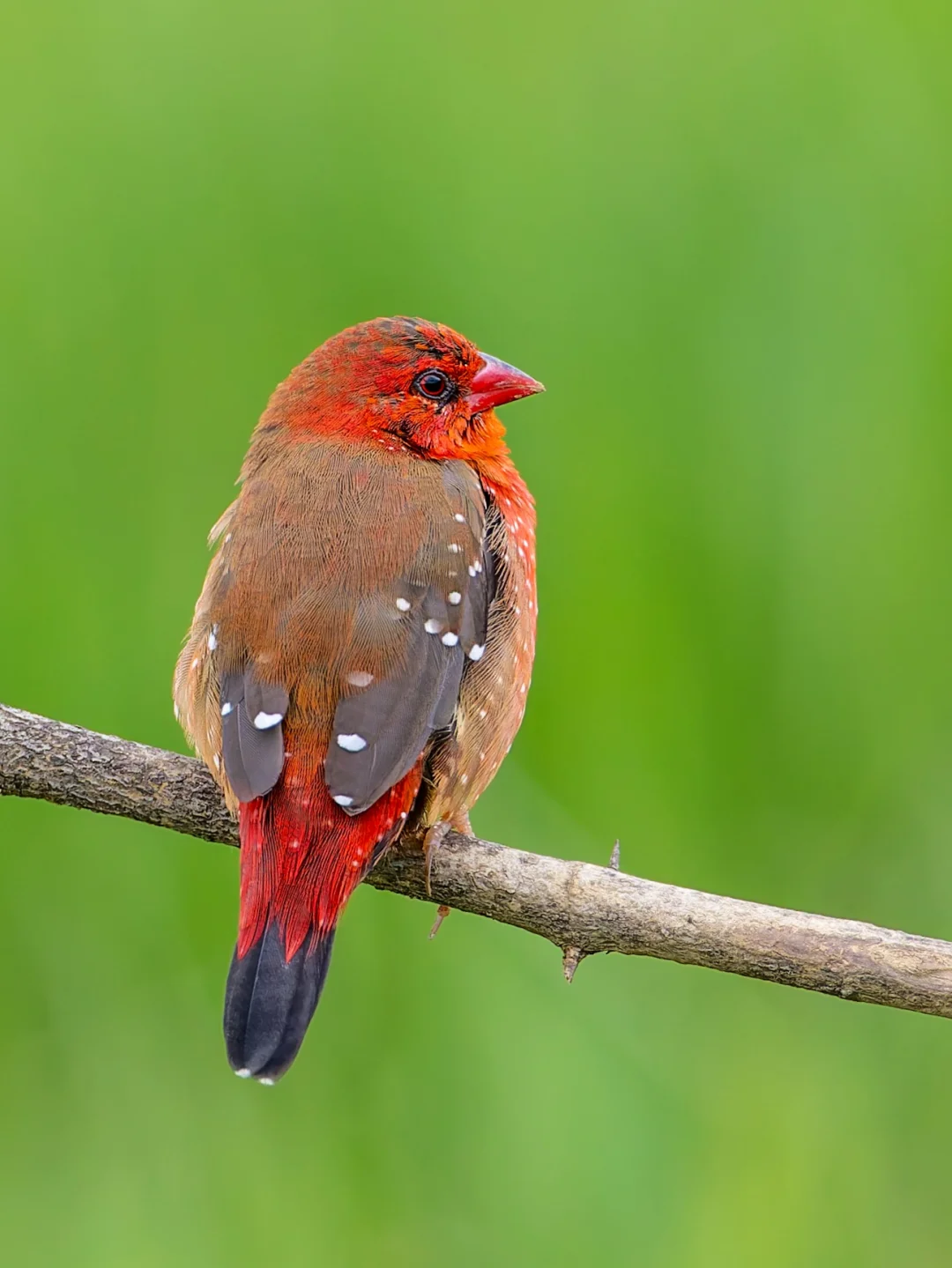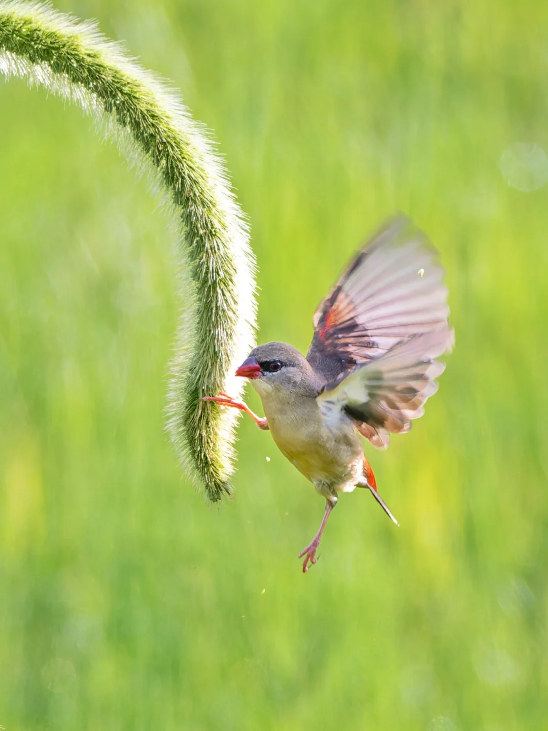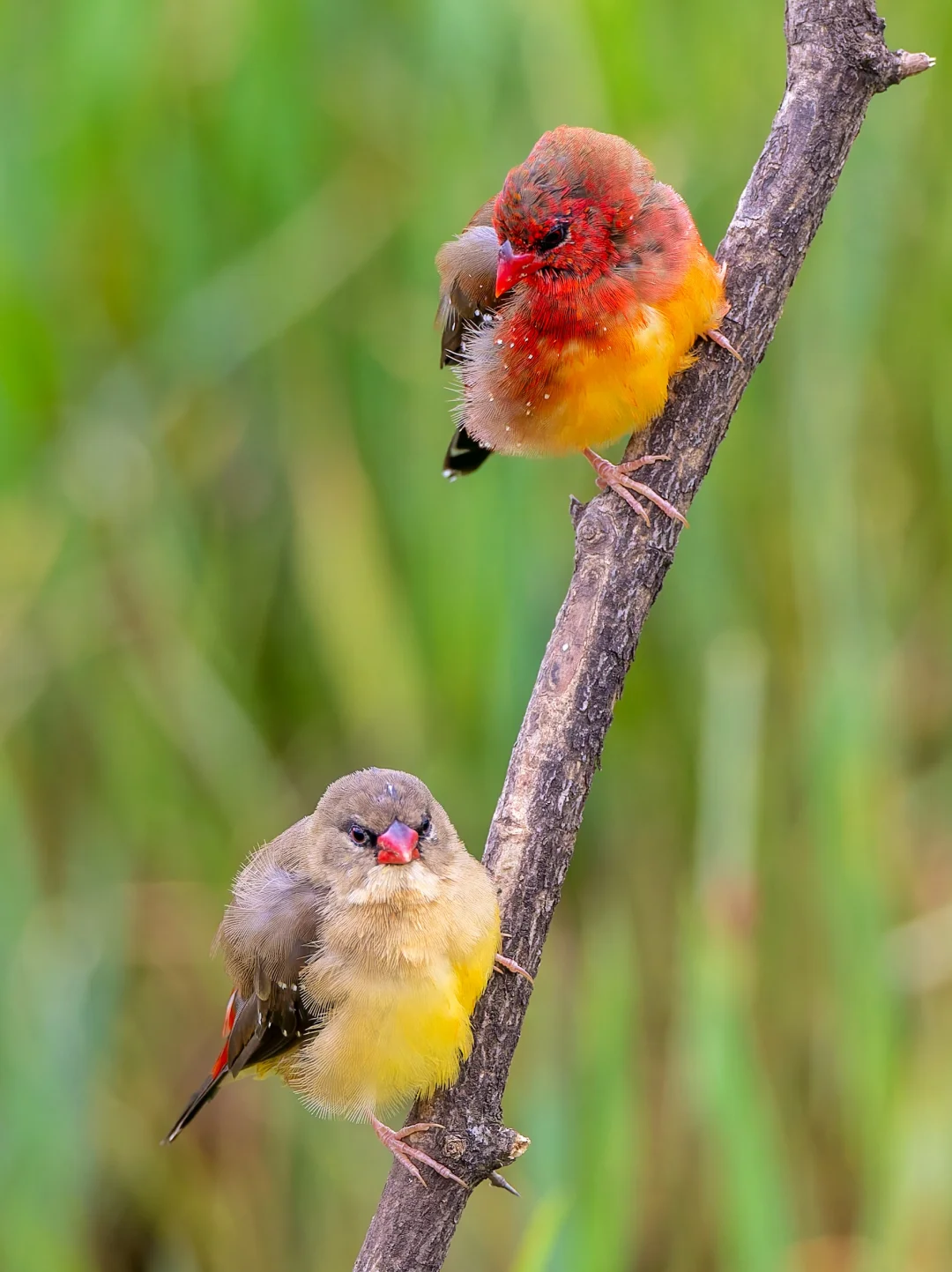 原创拍摄于2025.07 红梅花雀,Red Avadavat,雀形目梅花雀科红梅花雀属。注意这个名字的短句哈哈,是“红·梅花雀”,不是“红梅·花雀”,因为它就是一种梅花雀。红梅花雀是一种典型的南亚东南亚鸟种,在我国是边缘分布,只在云南和海南有一些种群。 红梅花雀形态美丽,雄鸟红色,点缀着小白点,犹如珍珠般璀璨,也特别像草莓🍓。雌鸟灰褐色,臀部和尾上覆羽带红色。 每年夏季6-9月正是在云南观赏这种美丽小草莓🍓的最佳时机啦。