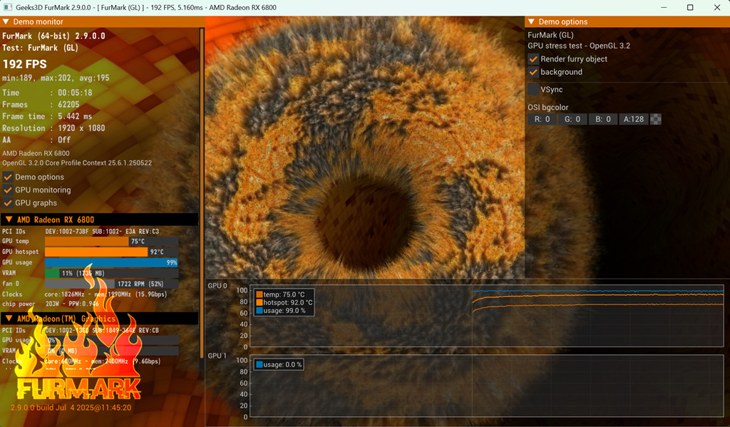 运行FUMARK拷机测试软件,让RX6800运行在烤机状态,测试此状态下整机功率,以及3.3V、5V、12V输出。