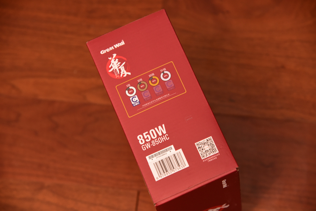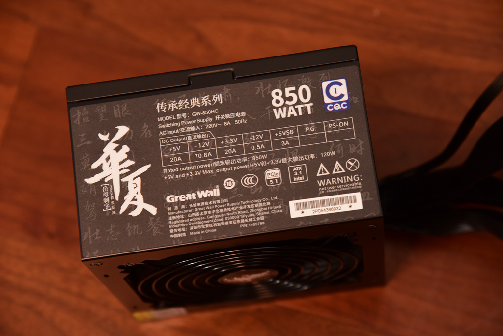 电源的型号是GW-850HC,提供为期5年的质保服务,通过中国质量认证中心(CQC)1级铜牌能效认证,转换效率为86%,达到了80Plus铜牌效率水平。