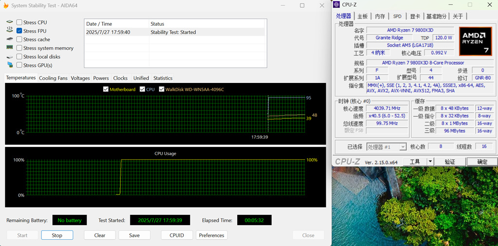 运行AIDA64系统稳定性测试模块,单勾选FPU选项,让9800X3D运行在拷机状态,测试此状态下整机功率,以及3.3V、5V、12V输出。