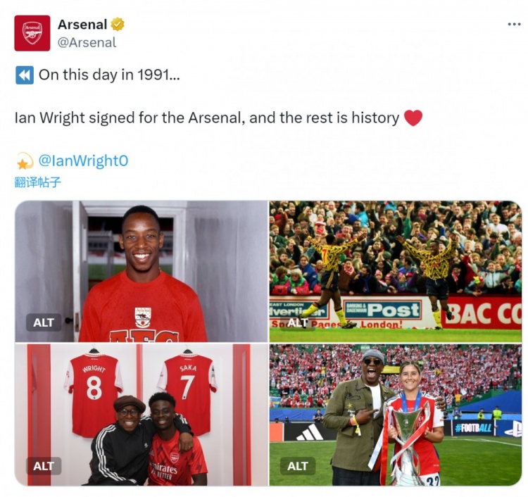 直播吧9月23日讯34年前的今天,伊恩-赖特加盟阿森纳,枪手官方社媒晒照片回顾。
