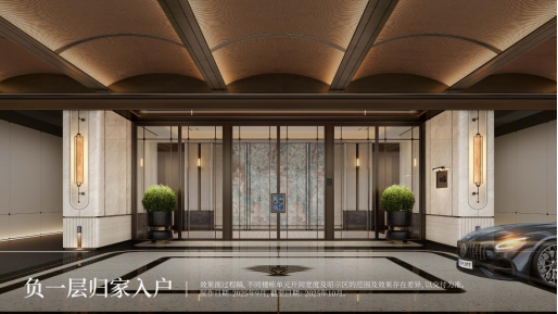 熠熠生辉的玉兰门庭掩映下,飞翼祥纹铜雕府门镶嵌非遗掐丝珐琅门钹,环抱式落客前场移步易景,敬候尊崇归家。
