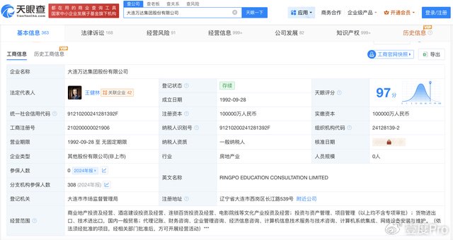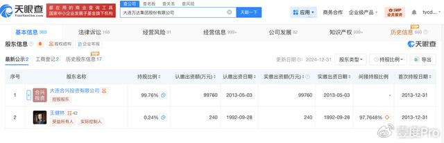 大连万达集团股份有限公司成立于1992年9月,注册资本10亿人民币,经营范围包括货物进出口、技术进出口、国内一般贸易等。股东信息显示,该公司由大连合兴投资有限公司、王健林共同持股。天眼风险信息显示,该公司现存10条被执行人信息,被执行总金额超52亿元,此外,该公司所持多家公司股权已被冻结。