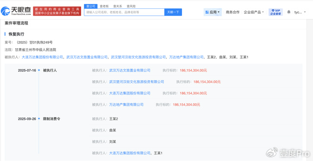 天眼查App显示,近日。大连万达集团股份有限公司及其法定代表人王健林新增一则限制消费令,执行法院为甘肃省兰州市中级人民法院。案件流程信息显示,今年7月,大连万达集团股份有限公司等已因此案被执行1.86亿余元。