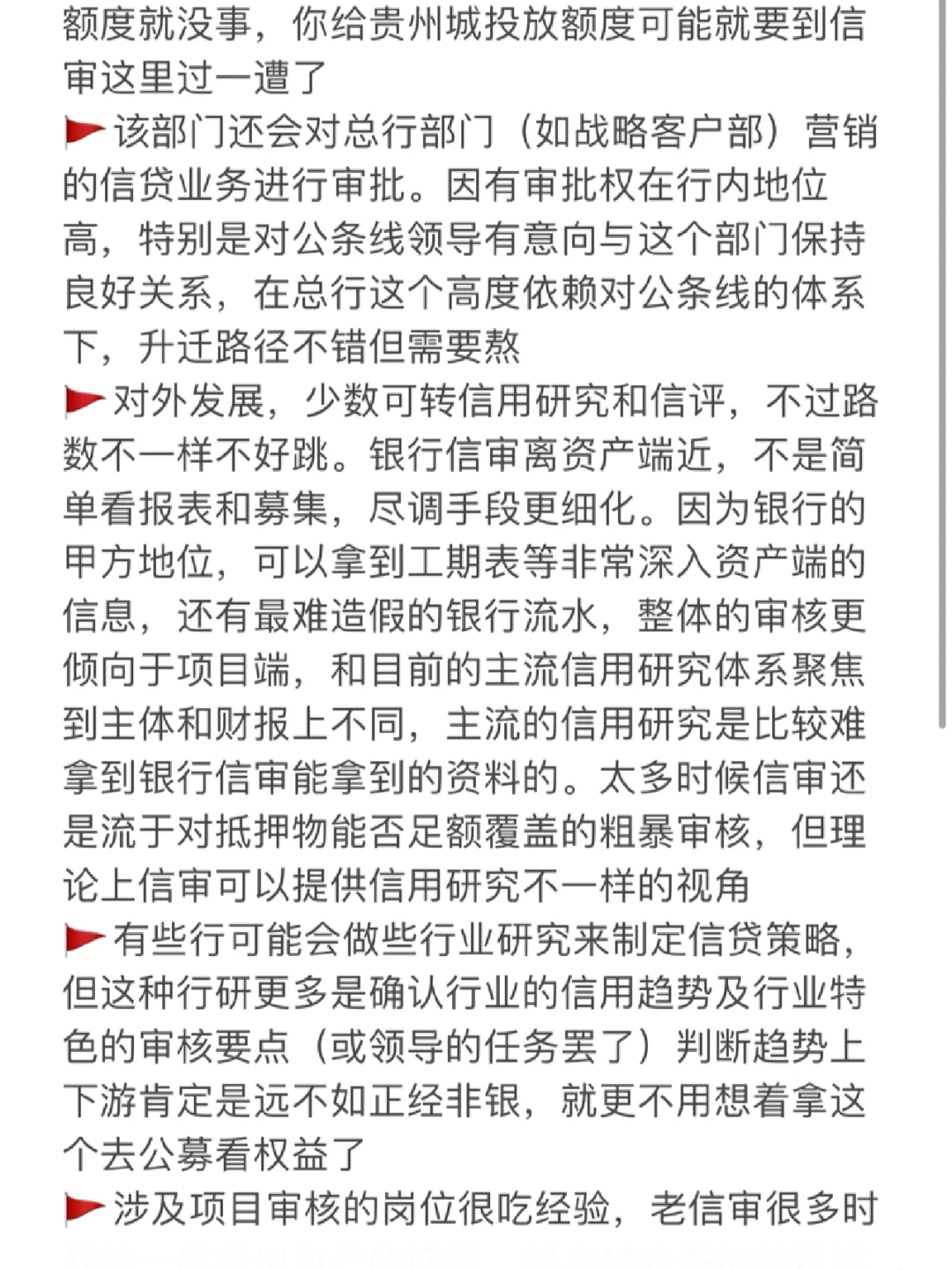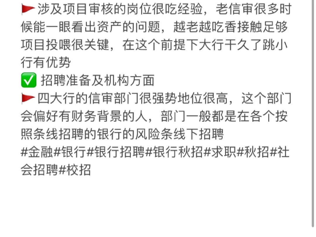 🚩涉及项目审核的岗位很吃经验,老信审很多时候能一眼看出资产的问题,越老越吃香接触足够项目投喂很关键,在这个前提下大行干久了跳小行有优势