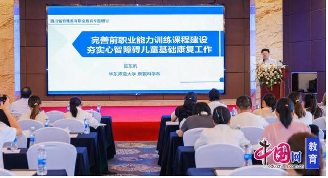 同时,成都市特殊教育学校校长闵菲将学校的百年传承与表达娓娓道来,并讲述了其核心理念、职业教育办学模式;南充市特殊教育学校校长唐春从培智职业教育的三个难题出发,解读了“9年义务教育+3年职业教育+N项职业技能拓展”模式的内涵、实施步骤与育人成效;汶川县特殊教育学校校长毛运兰带来以“与爱同行,七彩怡技”为题的民族地区残障学生职业技能教育发展探索分享;长沙市特殊教育学校校长王磊引出其“一体”进阶式培养目标和“双核”课程体系;自贡市富顺县特殊教育学校校长胡健阐述了富顺地区在培智中职学生就业中构建的“学校指导+企业接纳+社会支持”全链条支持体系;威远市特殊教育学校校长沈泽花立足于特校职业教育育人新方向,阐述了学校“三适”课程体系、“嵌入式”课程实施策略和“双元共建协同育人”体系等。