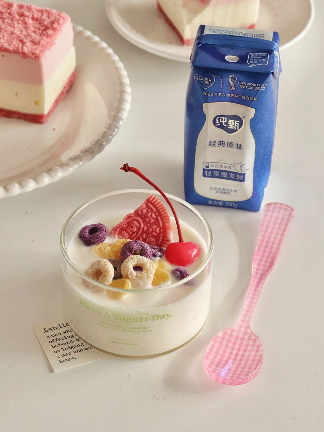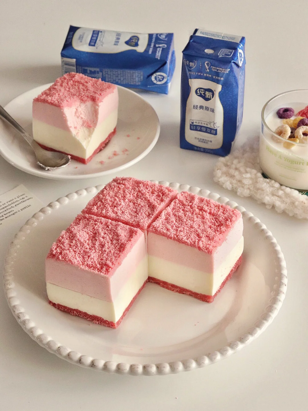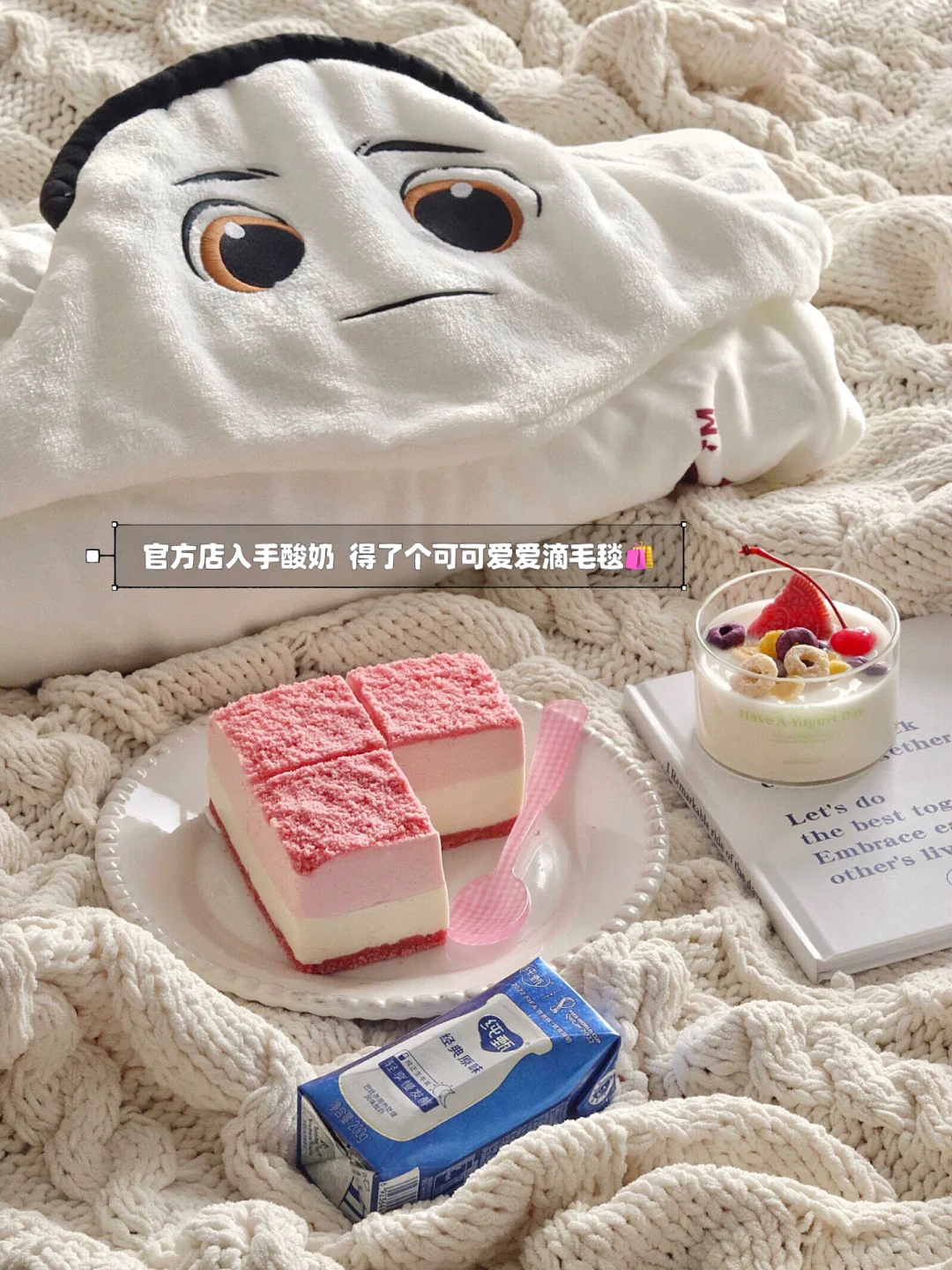 ✔用的纯甄原味酸奶,0添加香精色素明胶,平时家里也囤着这个喝,成分安心。生牛乳发酵,入口丝滑奶味醇厚。而且不用冷藏,常温保存就OK,现在天气冷,要多喝常温酸奶哦~这次在官方店入手酸奶时还发现了世界杯吉祥物拉伊卜的毛毯,软软和和的,这个冬天和纯甄一起看世界杯啦!