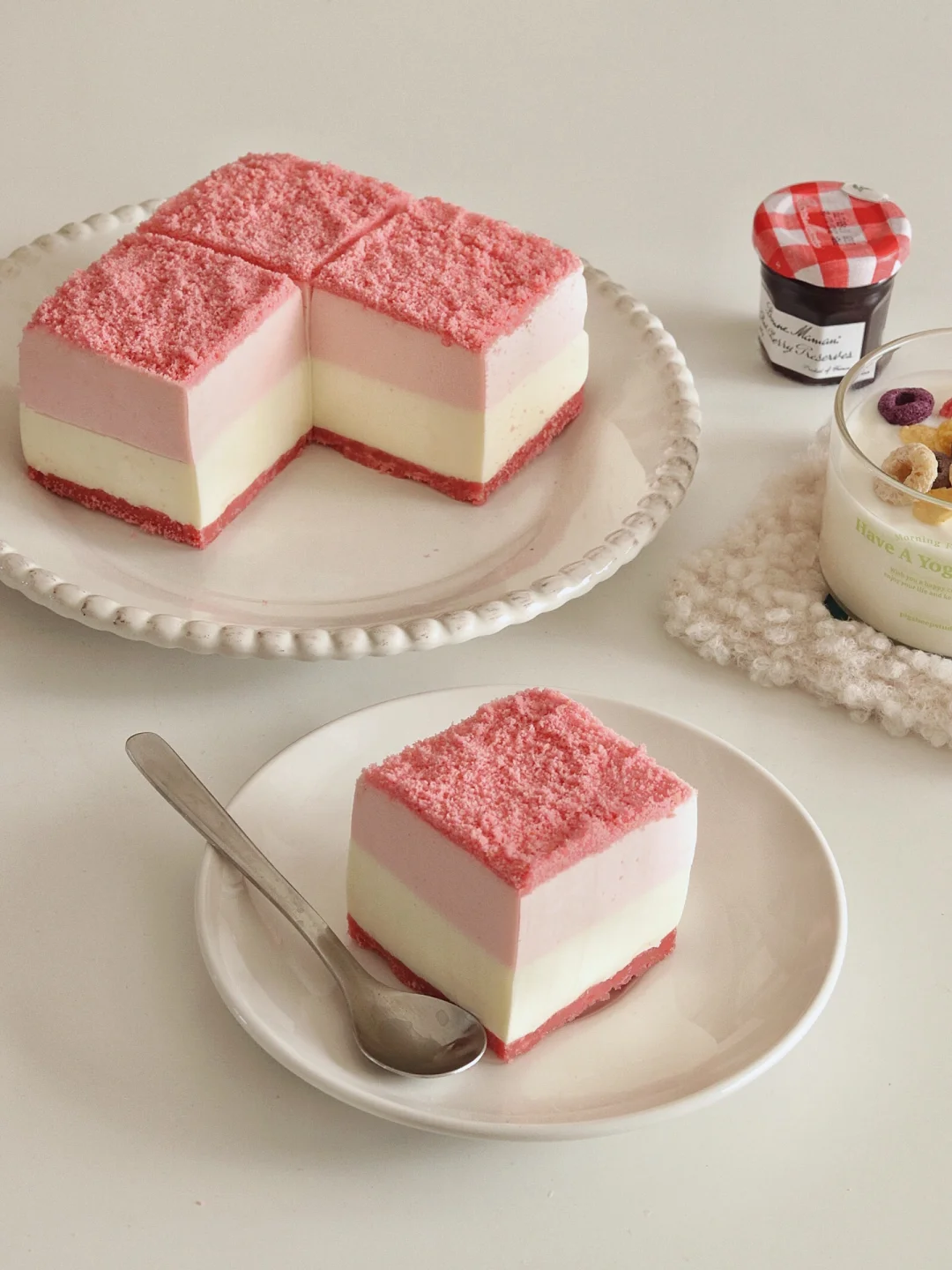 今天安排一款高颜值的酸奶慕斯,粉嫩少女心炸裂~做法简单,搅一搅就能成功哒[两颗心R]