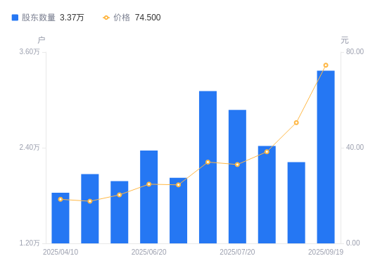 近一年(2024年9月30日至2025年9月19日),隆扬电子A股股东户数从2.53万户,增加至3.37万户,增幅33.33%,区间股价上涨470.79%。