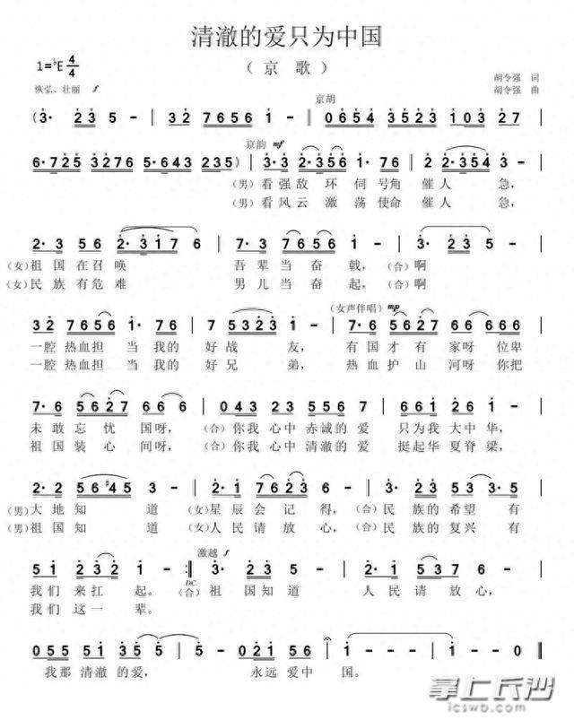 长沙晚报掌上长沙10月1日讯(全媒体记者肖舞)“你我清澈的爱,挺起华夏脊梁,清澈的爱只为中国……”今天是国庆节,大街小巷已是满眼“中国红”。宁乡市音协主席、二级作曲胡令强作词作曲的京歌《清澈的爱只为中国》在长沙首发,用最真挚的旋律为祖国祝福,表现广大民众的拳拳爱国之心。