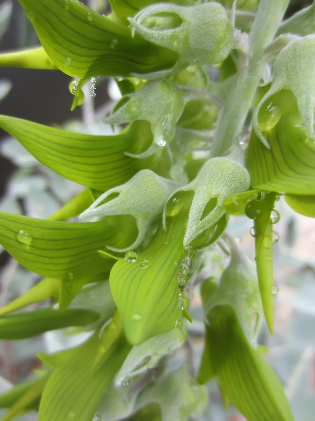 ✨花朵形似蜂鸟悬停,花萼翡翠色带黑斑纹