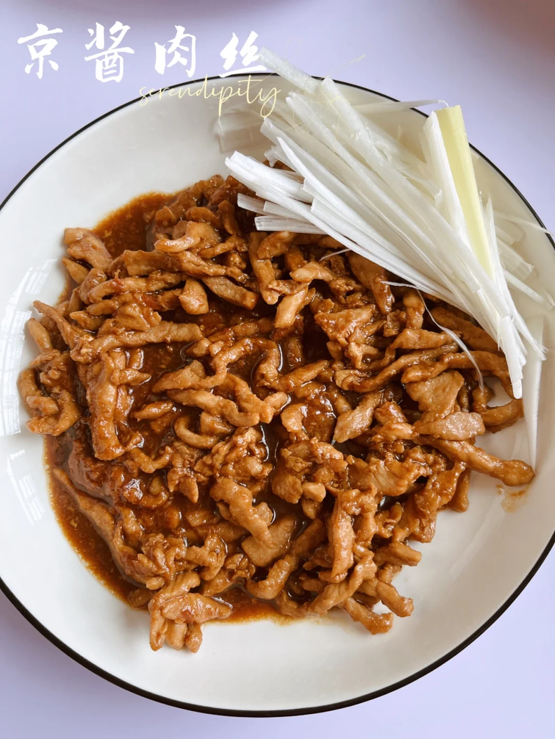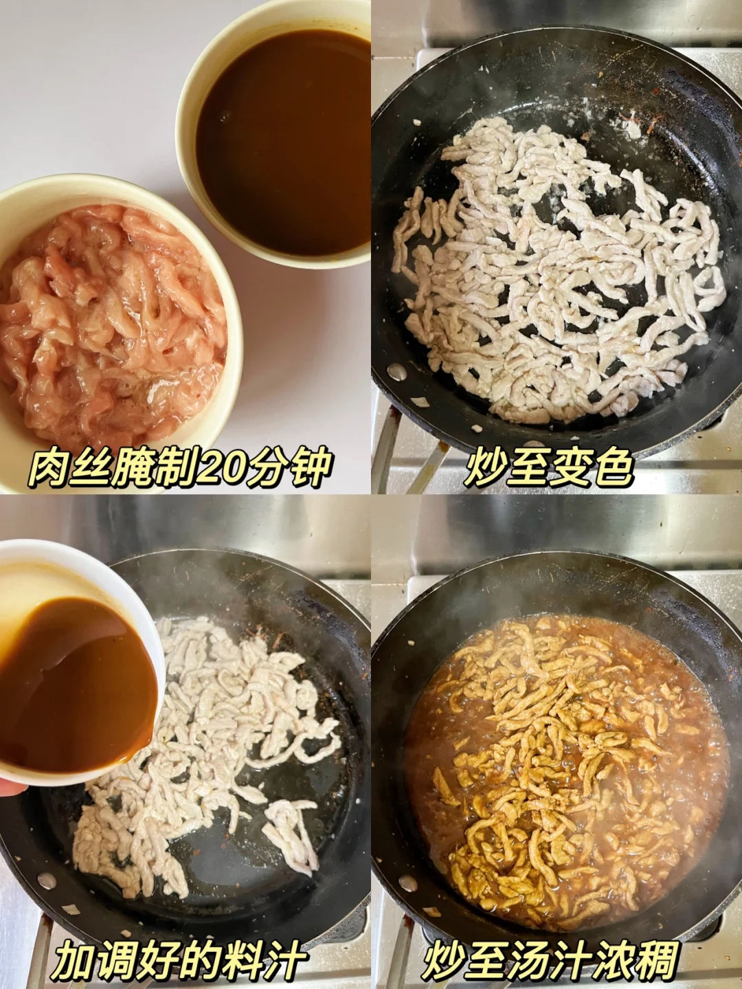 3️⃣油稍微多点,肉丝炒变色,加入酱料翻炒至酱汁浓稠,搭配葱丝