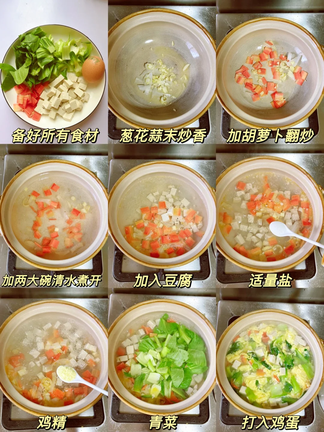 4️⃣加豆腐煮1分钟,加入青菜煮熟