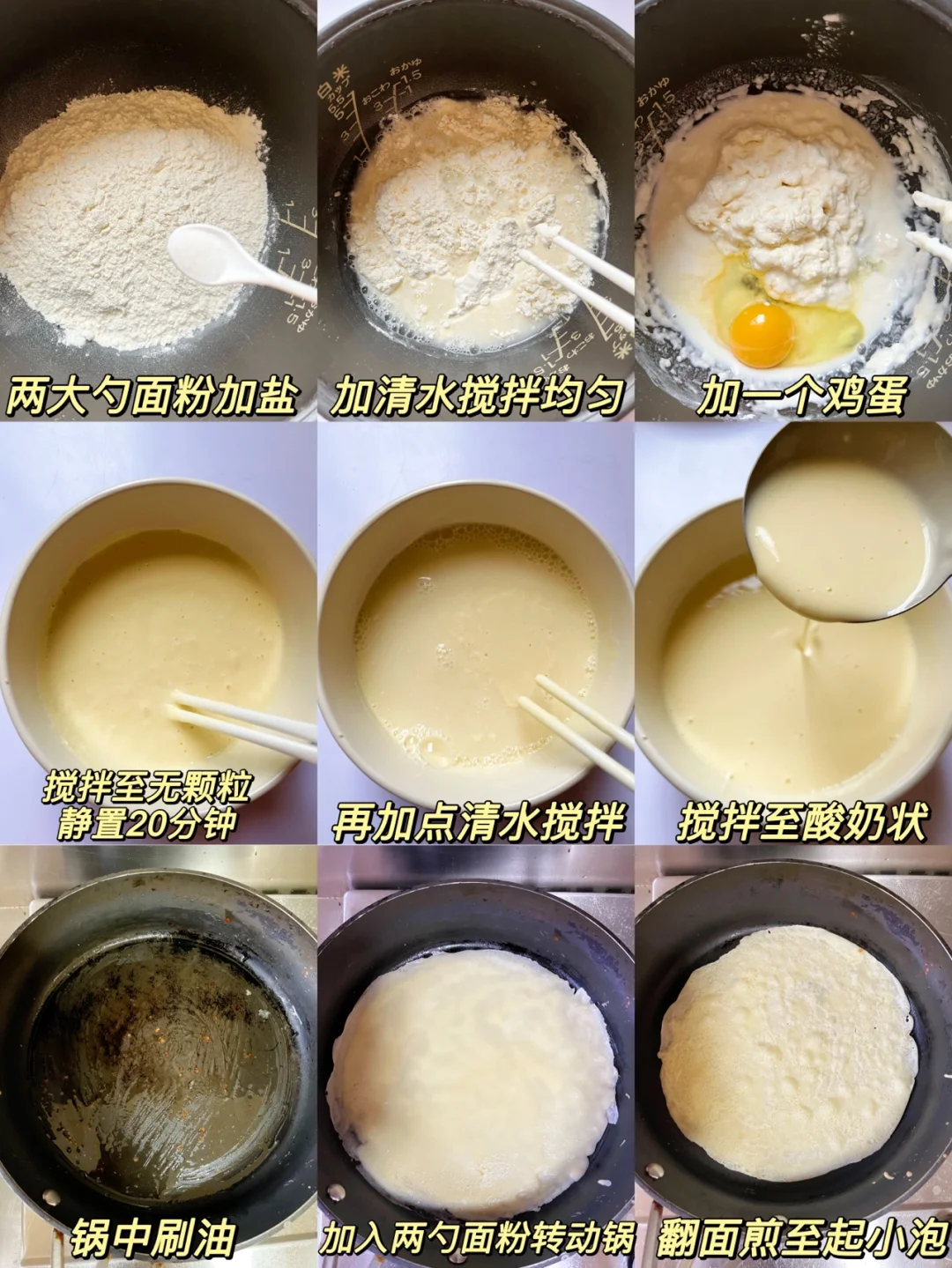 1️⃣两大碗面粉➕盐➕一个鸡蛋➕清水搅拌至无颗粒,静置20分钟,再加清水搅拌至酸奶状