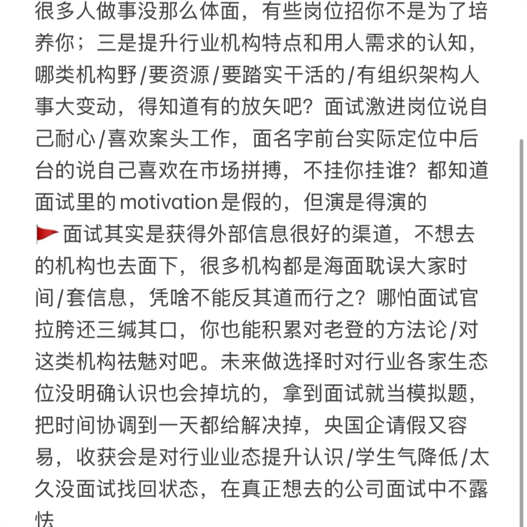 🚩面试其实是获得外部信息很好的渠道,不想去的机构也去面下,很多机构都是海面耽误大家时间/套信息,凭啥不能反其道而行之?哪怕面试官拉胯还三缄其口,你也能积累对老登的方法论/对这类机构祛魅对吧。未来做选择时对行业各家生态位没明确认识也会掉坑的,拿到面试就当模拟题,把时间协调到一天都给解决掉,央国企请假又容易,收获会是对行业业态提升认识/学生气降低/太久没面试找回状态,在真正想去的公司面试中不露怯