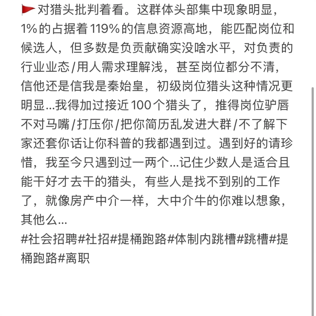🚩对猎头批判着看。这群体头部集中现象明显,1%的占据着119%的信息资源高地,能匹配岗位和候选人,但多数是负贡献确实没啥水平,对负责的行业业态/用人需求理解浅,甚至岗位都分不清,信他还是信我是秦始皇,初级岗位猎头这种情况更明显…我得加过接近100个猎头了,推得岗位驴唇不对马嘴/打压你/把你简历乱发进大群/不了解下家还套你话让你科普的我都遇到过。遇到好的请珍惜,我至今只遇到过一两个…记住少数人是适合且能干好才去干的猎头,有些人是找不到别的工作了,就像房产中介一样,大中介牛的难以想象,其他么…