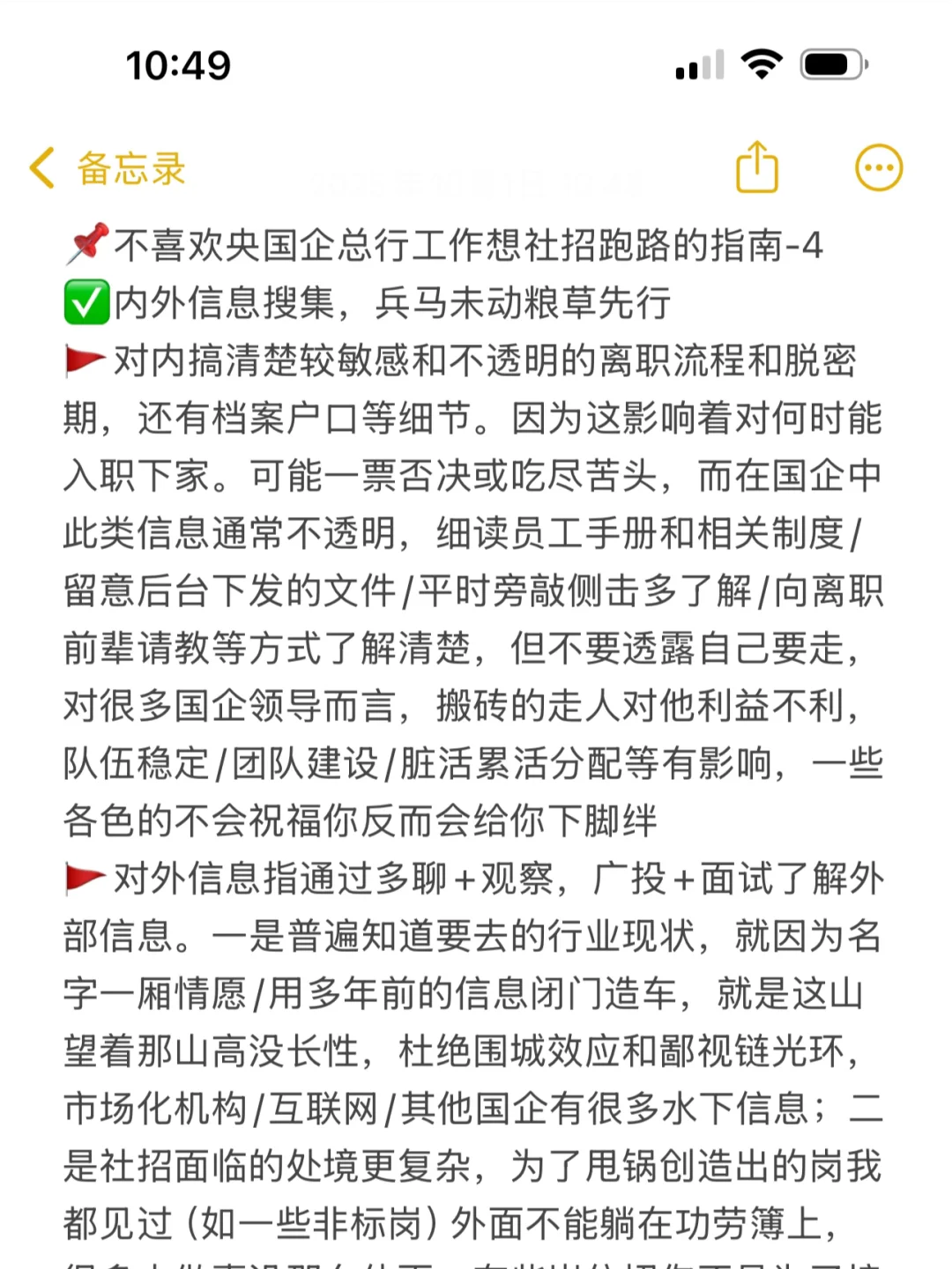 🚩对内搞清楚较敏感和不透明的离职流程和脱密期,还有档案户口等细节。因为这影响着对何时能入职下家。可能一票否决或吃尽苦头,而在国企中此类信息通常不透明,细读员工手册和相关制度/留意后台下发的文件/平时旁敲侧击多了解/向离职前辈请教等方式了解清楚,但不要透露自己要走,对很多国企领导而言,搬砖的走人对他利益不利,队伍稳定/团队建设/脏活累活分配等有影响,一些各色的不会祝福你反而会给你下脚绊