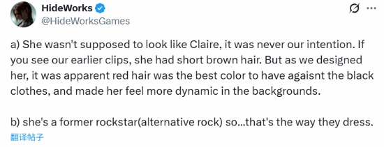HideWorks表示,他们并未刻意追求与克莱尔的相似性。“早期的莉拉有着棕色短发,但在角色设计过程中,我们意识到红发与黑衣搭配最为出彩,能使她在各类场景中更显鲜活灵动。况且,她曾是另类摇滚歌手,这身装扮正是摇滚圈的常态。”