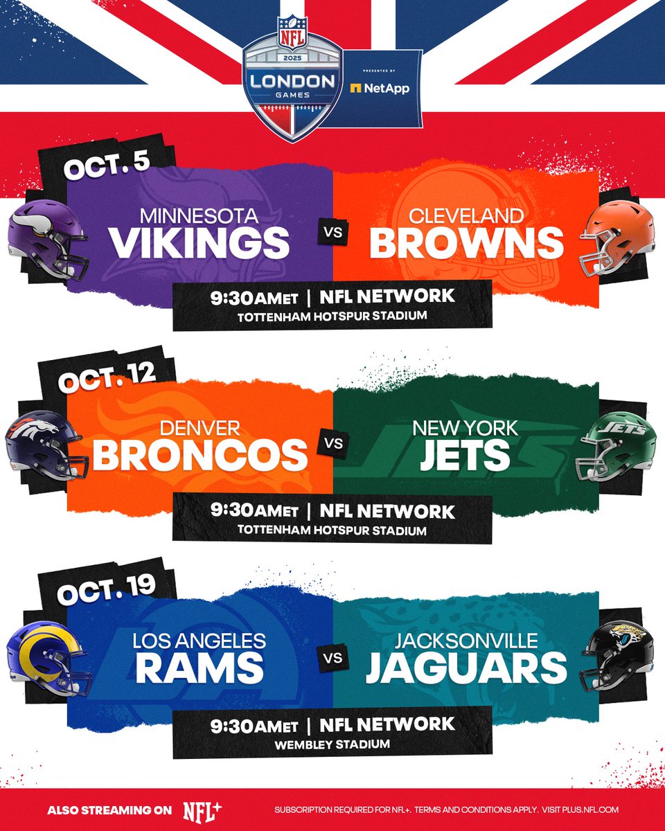 NFL官方X账号发文透露:连续三周伦敦赛即将上演!明尼苏达维京人vs克利夫兰布朗——北京时间周日21:30于@nflnetwork直播同时可通过@NFLPlus流媒体平台观看