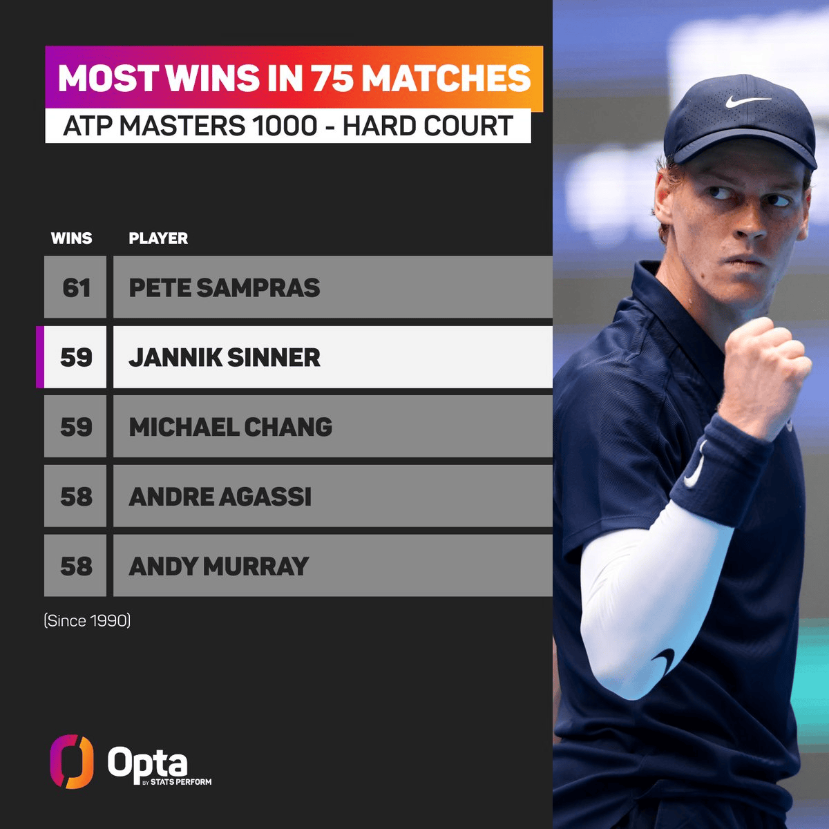 据OptaAce统计,辛纳目前在ATP硬地大师赛前75场比赛中取得59场胜利,自1990年以来,只有皮特-桑普拉斯(61胜)在相同场次的硬地大师赛开局阶段胜场数比他更多。