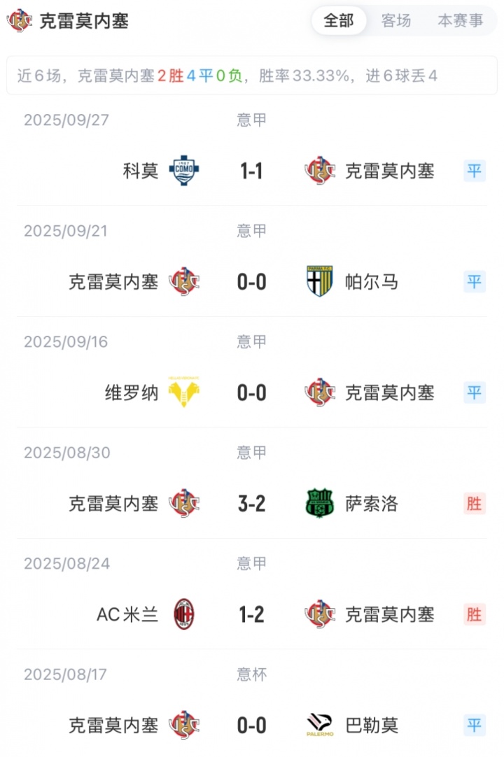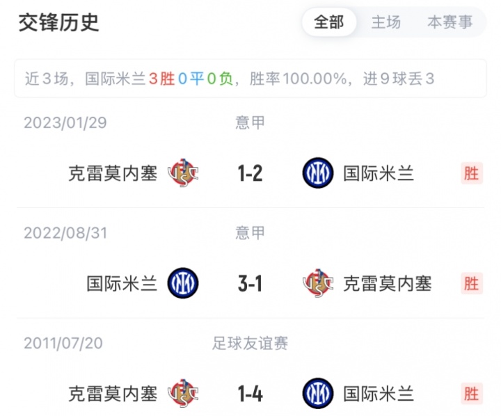国米vs克雷莫内塞首发