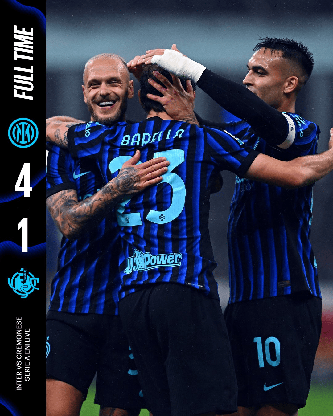 虎扑10月05日讯意甲第6轮,国际米兰主场4-1大胜克雷莫纳。