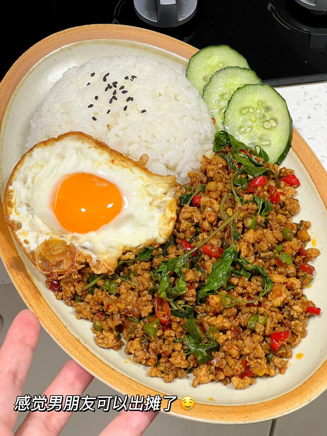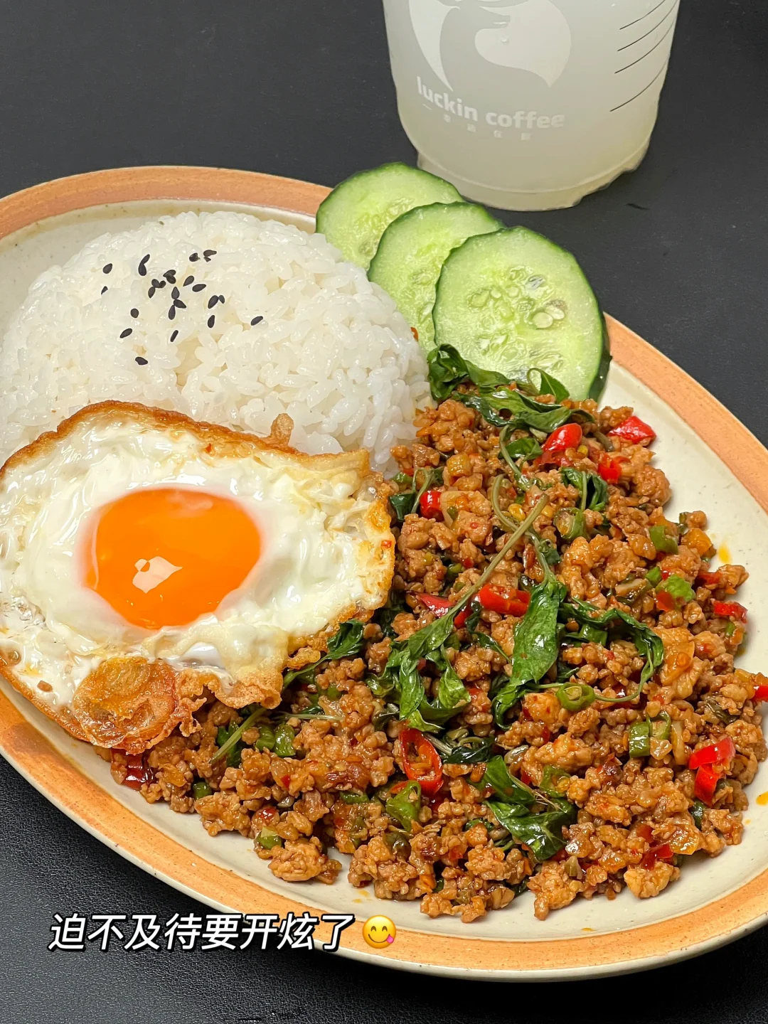 早就想试试这个打抛饭了,终于吃上了 没有打抛叶,让男朋友用的九层塔,又名金不换,我们赣州家乡话叫“鱼香子” 应该算是做成功了叭?[暗中观察R] 好吃,下次还要做!!!
