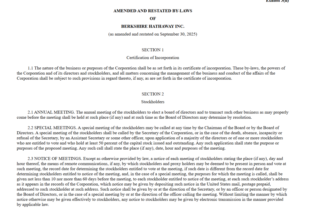 根据伯克希尔公司向美国证券交易委员会(SEC)提交的文件,其董事会已于9月30日投票通过修改公司章程,正式将董事长与CEO的职位分离。
