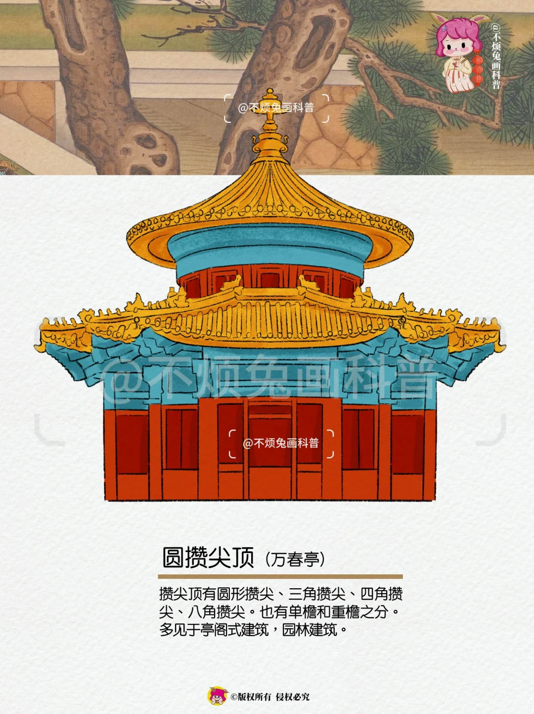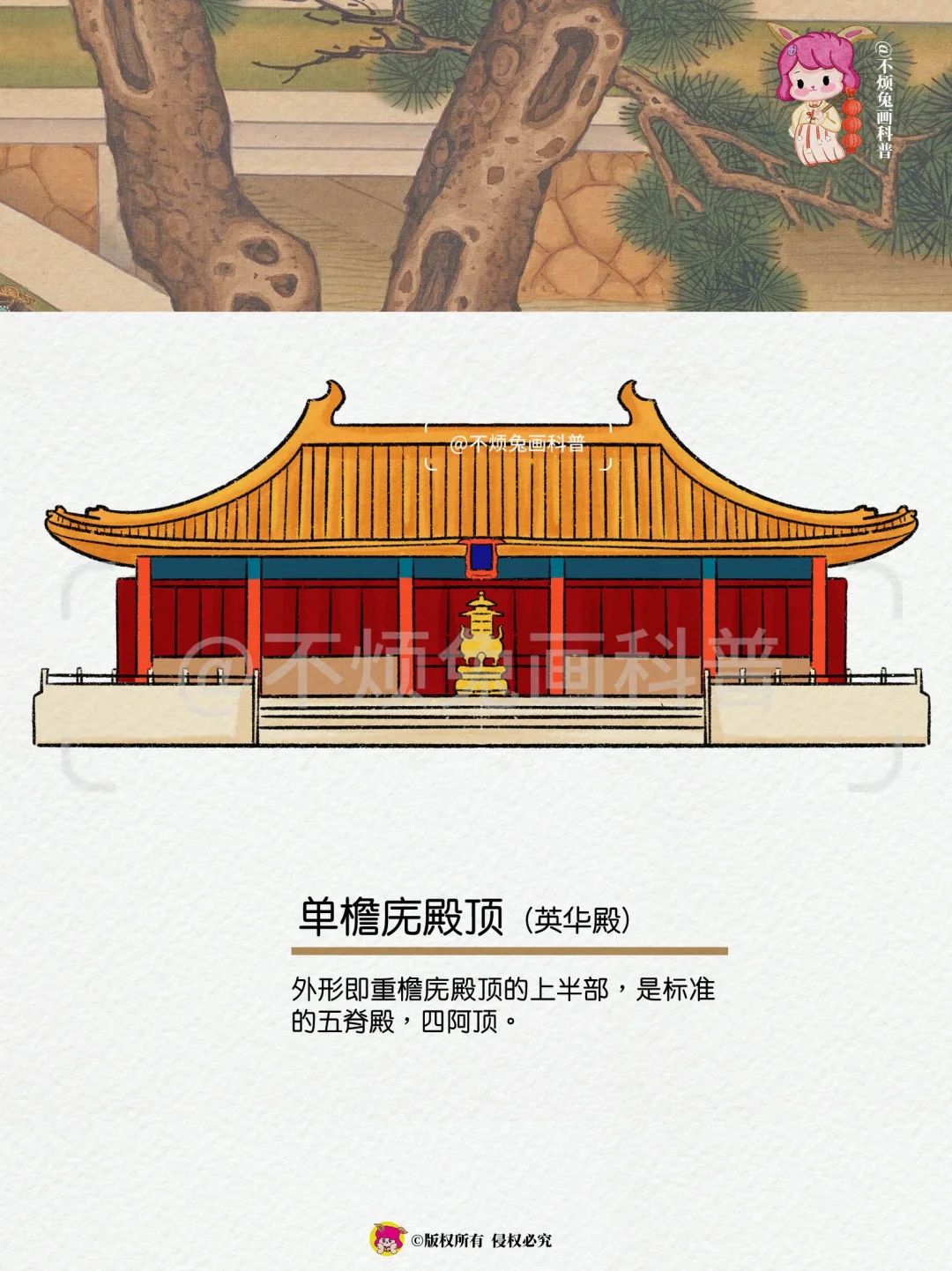 🏡一组图看懂故宫里的9种屋顶形式! 故宫里的建筑屋顶形式及其代表建筑。故宫的屋顶,早已不再单纯用来遮风挡雨。当我们站在故宫的广场上,仰望那些金碧辉煌的琉璃瓦,他们仿佛诉说着宣室玉堂,重阶金顶,是属于这片土地的骄傲。 - 1️⃣重檐庑殿顶(太和殿) 2️⃣单檐庑殿顶(英华殿) 3️⃣重檐歇山顶(天安门) 4️⃣单檐歇山顶(武英殿) 5️⃣盝顶(钦安殿) 6️⃣四角攒尖(中和殿) 7️⃣圆攒尖顶(万春亭) 8️⃣硬山殿(体和殿) 9️⃣悬山顶(神橱库) -
