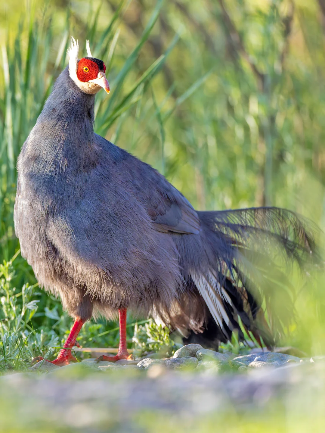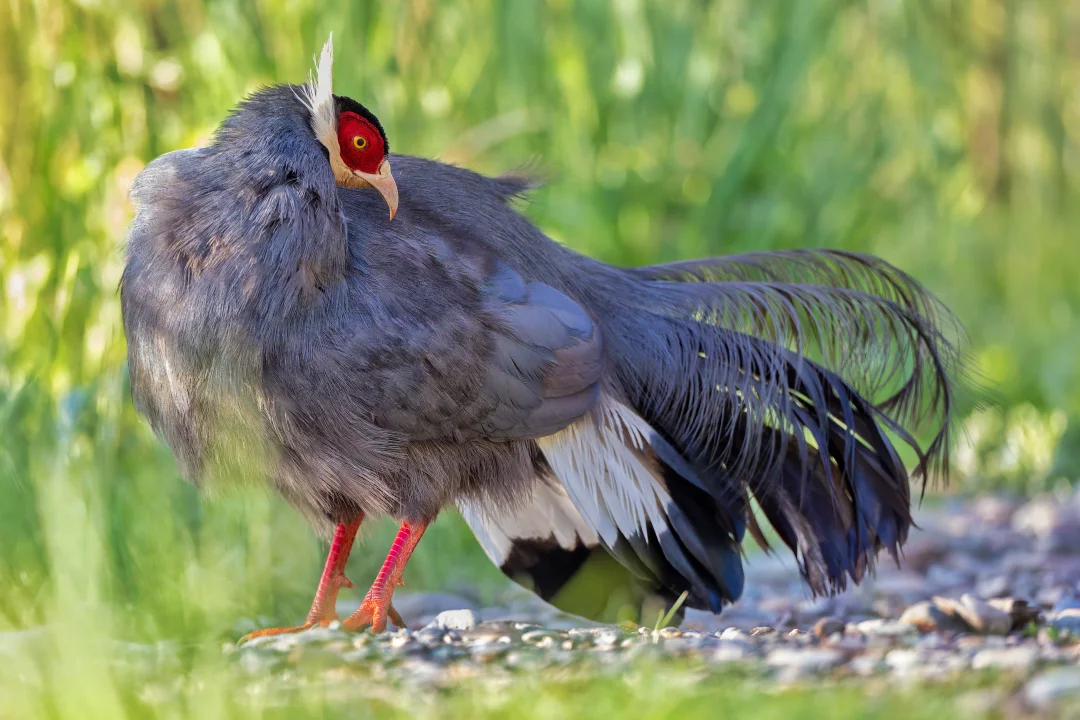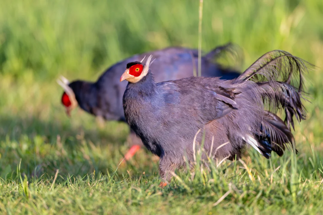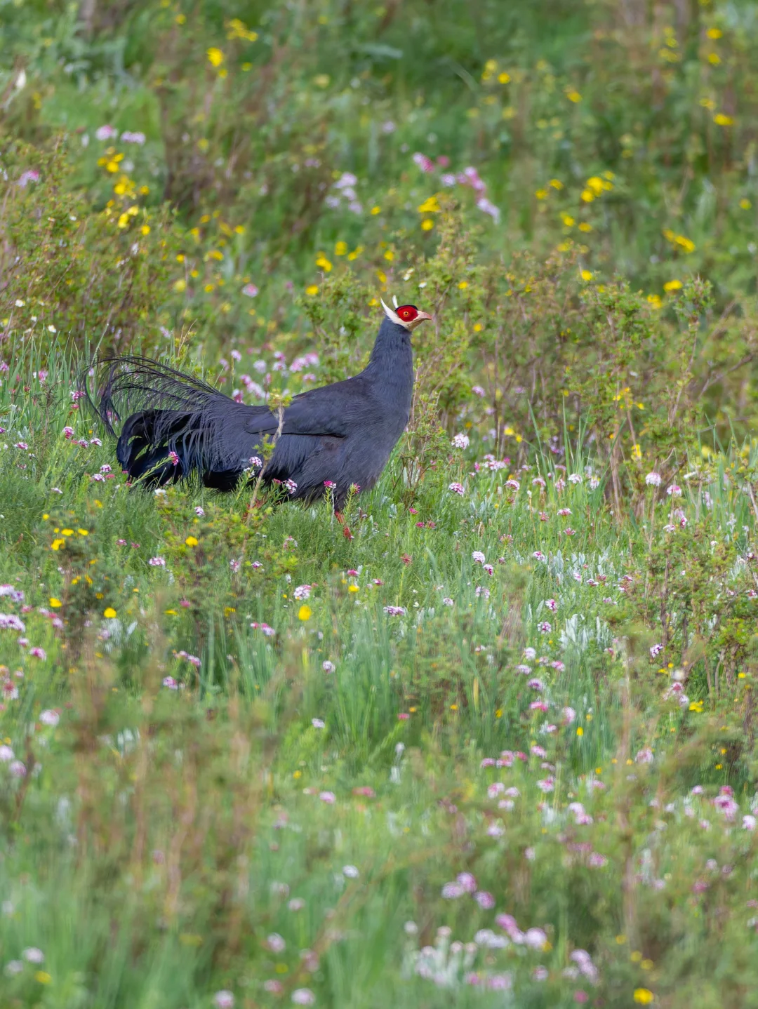 原创拍摄于2025.07 蓝马鸡,Blue Eared Pheasant,鸡形目雉科马鸡属。中国特有种,国家二级保护动物,分布于我国西部高原。全世界有4种漂亮的马鸡,都分布在我国。 蓝马鸡拥有独特的灰蓝色羽毛,在阳光下显出蓝紫色。另外马鸡醒目的白耳簇和红脸也是它们的特征。 在甘肃和青海东部,蓝马鸡种群还是比较丰富,在祁连山保护区几次看到蓝马鸡,每次都会停下车好好欣赏。还看到蓝马鸡带幼鸟p7,和满是鲜花草地的美丽一幕p5~6。