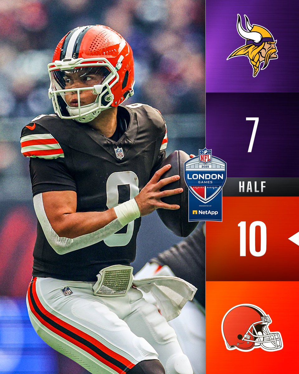 NFL官方X账号发推特报道。伦敦站比赛进入中场休息。@NFLUKIRE明尼苏达对阵克利夫兰的比赛正在@nflnetwork直播,同时可通过@NFLPlus流媒体观看