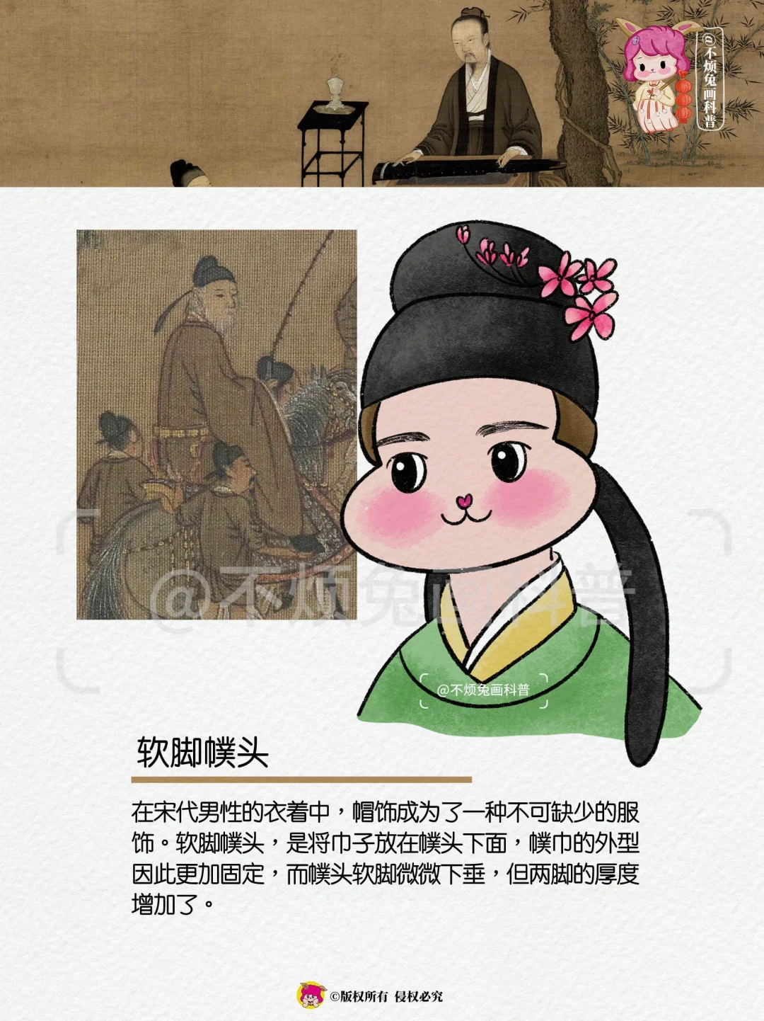 在宋代男性的衣着中,帽饰成为了一种不可缺少的服饰。软脚幞头,是将巾子放在幞头下面,幞巾的外型因此更加固定,而幞头软脚微微下垂,但两脚的厚度增加了。