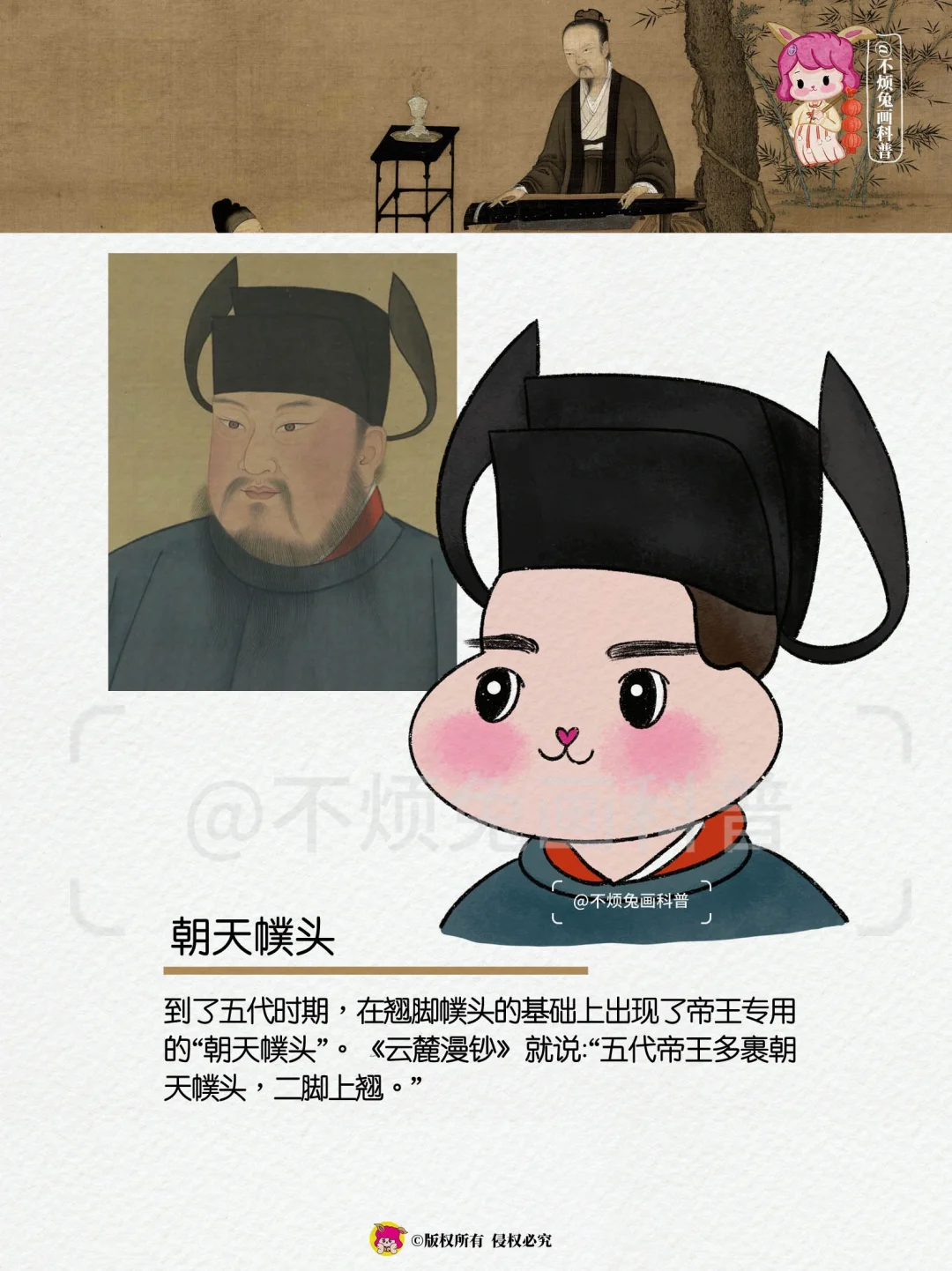 到了五代时期,在翘脚幞头的基础上出现了帝王专用的“朝天幞头”。《云麓漫钞》就说:“五代帝王多裹朝天幞头,二脚上翘。”