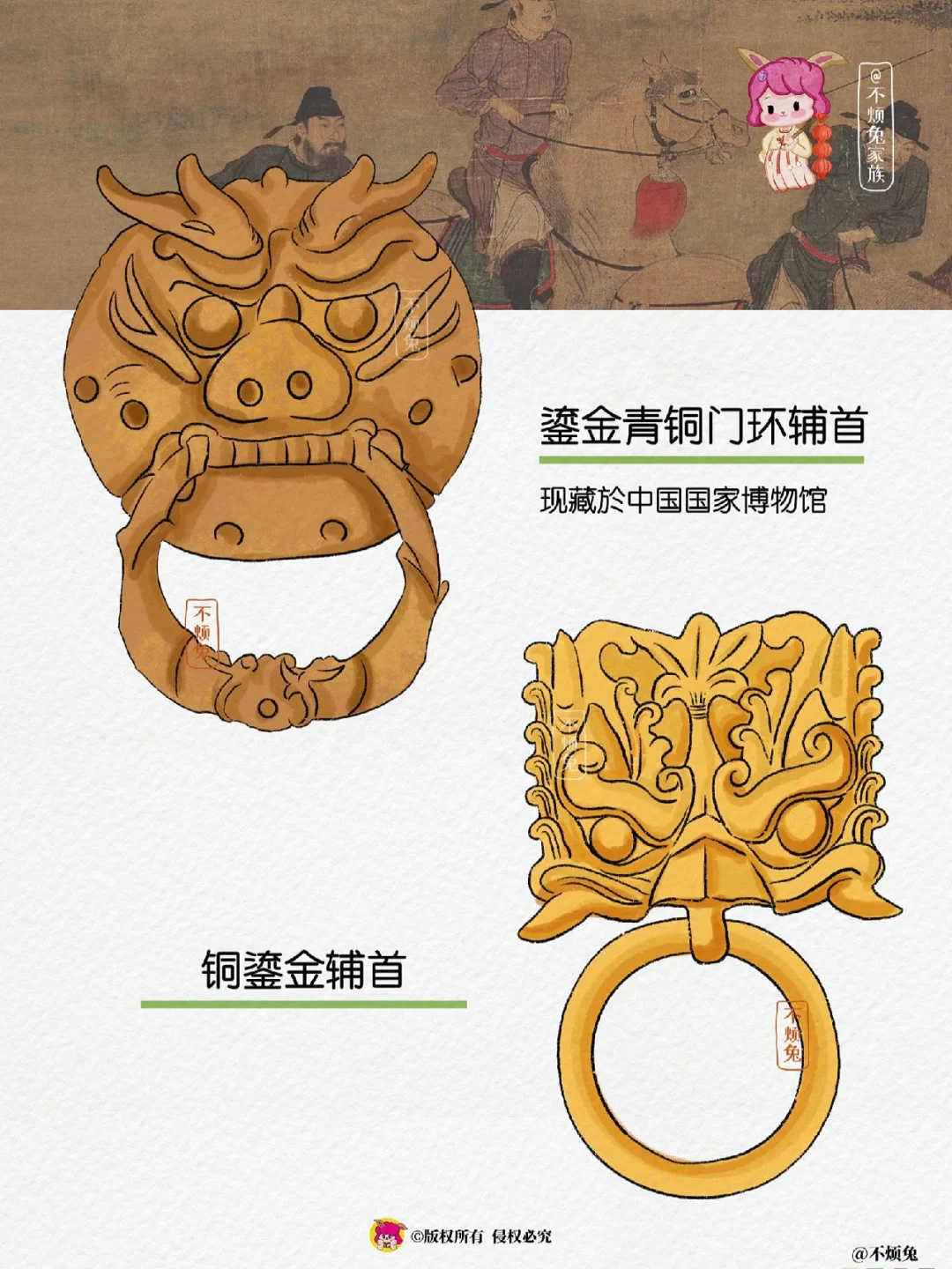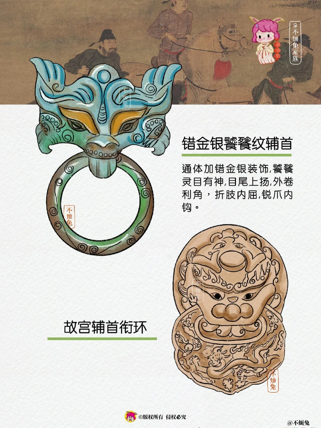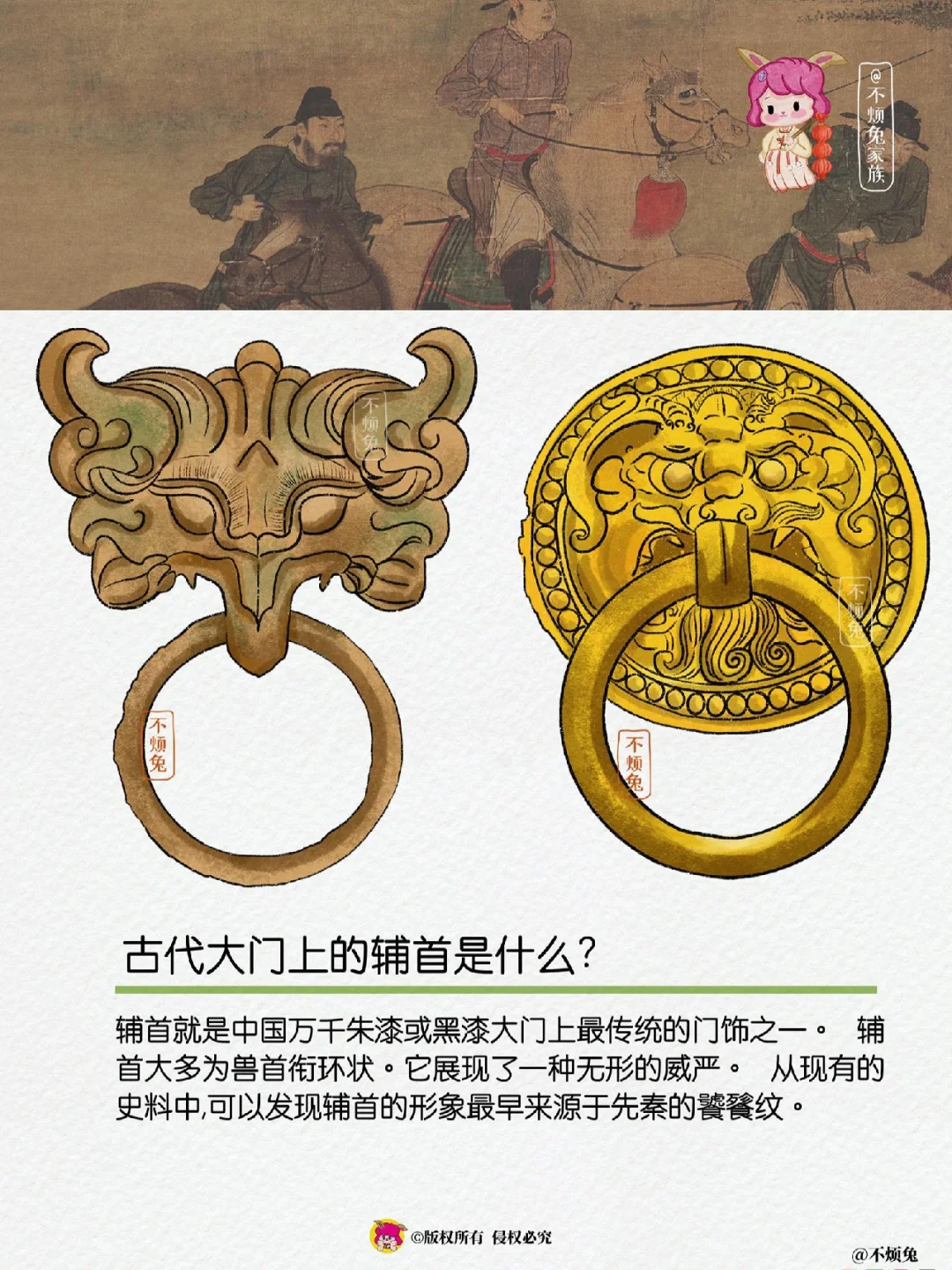 🟢辅首就是中国万千朱漆或黑漆大门上最传统的门饰之一。 辅首大多为兽首衔环状。它展现了一种无形的威严。 从现有的史料中,可以发现辅首的形象最早来源于先秦的饕餮纹。