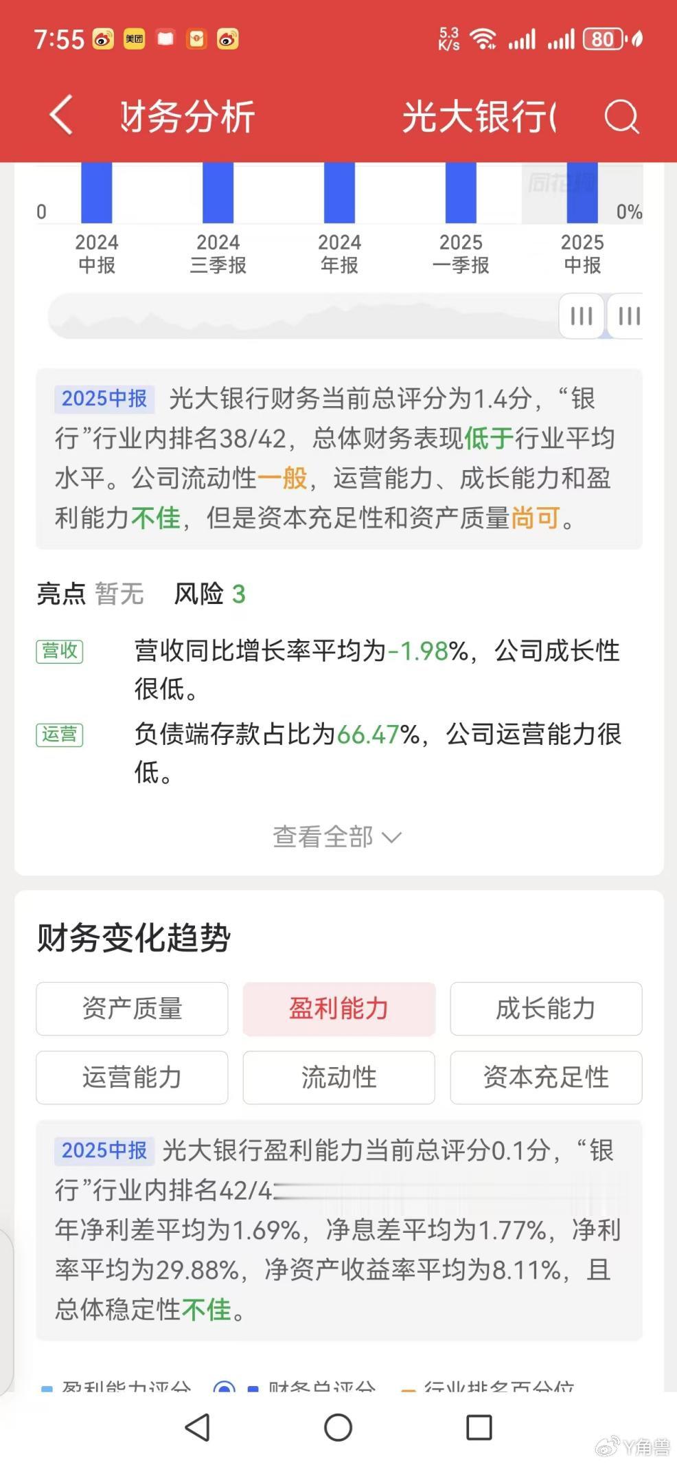 事实上,至少从去年半年报以来的一年时间内,光大银行发布的季报和半年报,净利差、净息差等多个指标上,确实低于行业平均水平。