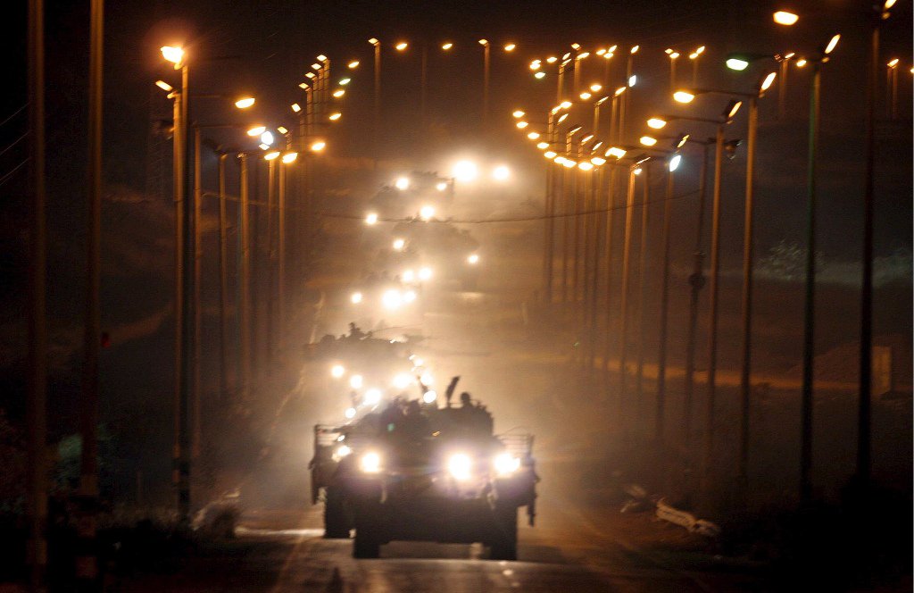 当地时间2005年9月12日,加沙地带,以色列装甲车队从加沙地带撤离,驶向基苏菲姆过境点。视觉中国图