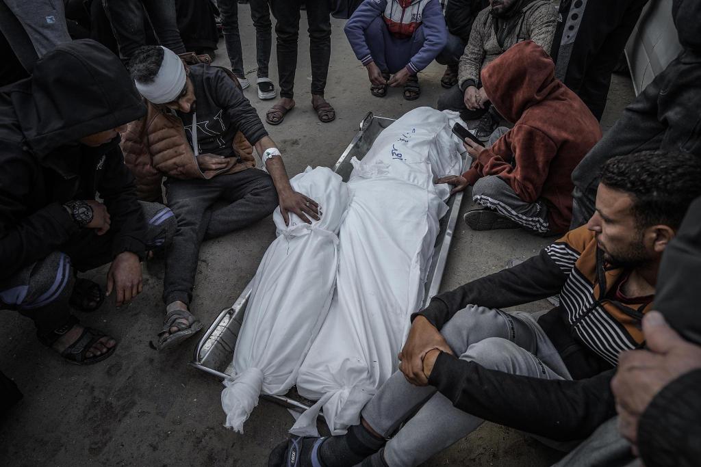 当地时间2023年12月26日,加沙地带汗尤尼斯,在亲人的尸体旁,人们哀悼。视觉中国图