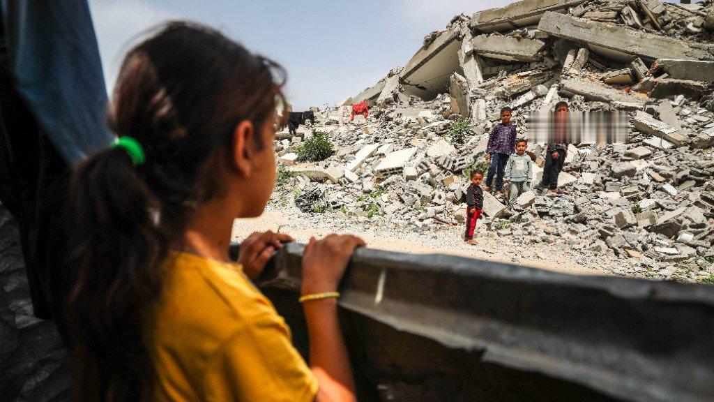 当地时间2025年4月7日,在加沙地带北部加沙,流离失所的儿童看着废墟。新华社图