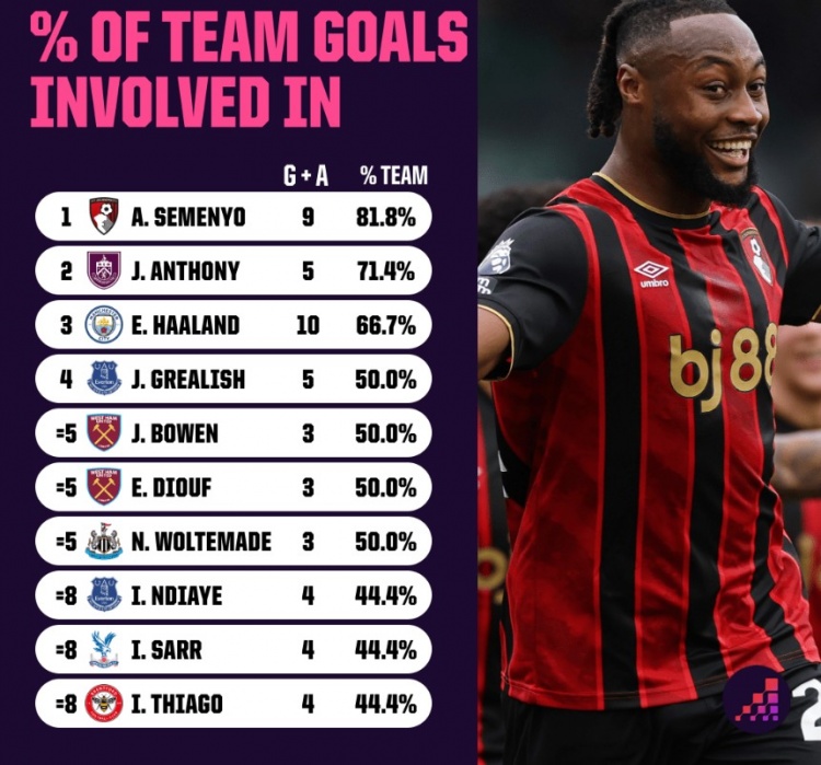 直播吧10月8日讯本赛季,伯恩茅斯边锋塞梅尼奥延续了出色的状态,他在球队进攻中的重要性不言而喻。根据OPTA的数据统计,塞梅尼奥参与进球数占球队总进球数的81.8%,为英超球员最高。