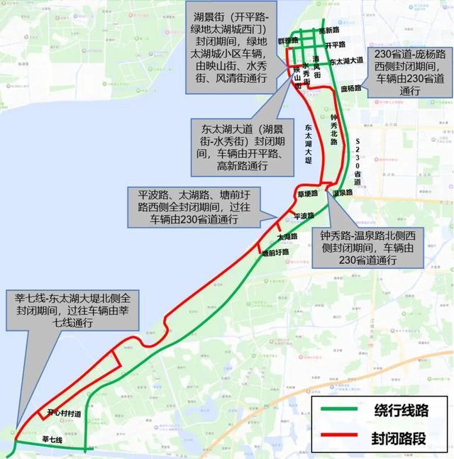 230省道庞杨路路口西侧实施全封闭(路口由南向西、由东向西、由北向西全部禁行)、东太湖余霞路迎宾大道路口东侧交通管制(东向西禁行)、东太湖大道映山街交通管制(北向南禁行)、东太湖大道水秀街交通管制(东向西禁行)、开平路映山街路口交通管制(东向西禁行)、开平路湖景街路口交通管制(北向南禁行)、钟秀路温泉路北侧全封闭(南向北禁行)、平波路温泉酒店门口西侧全封闭(东向西禁行)、草埂路太湖路东侧全封闭(东向西禁行)、草埂路塘前圩东侧全封闭(东向西禁行)、规划路西湖村田埂东侧全封闭(东向西禁行)、环湖大堤太湖绿洲路口东侧太湖绿洲内部道路全部封闭(太湖绿洲入口禁行、230省道报恩寺路口中小路东向西禁行)、亭子港村口西侧全封闭(东向西禁行)、圩内横草路叶家港港西路西侧全封闭(东向西禁行)。