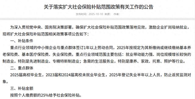补贴重点面向2025届高校毕业生,2023届和2024届离校未就业毕业生,2025年登记失业半年以上人员,防止返贫监测对象等群体。补贴金额方面,按照个人缴费额的25%给予社会保险补贴。