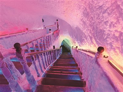 小心翼翼地沿着冰道继续往冰洞的深处走,洞内的景致仍是异彩缤纷。冰柱、冰帘、冰瀑、冰挂、冰锥、冰人,造型各异,天然成趣,令人赞叹不已。这是大自然的鬼斧神工,更是大自然赐予的魔幻胜景,精妙绝伦。