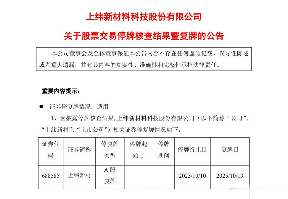 由于股价存在异常波动,上纬新材自今年9月26日开始停牌核查,直至10月13日复牌。