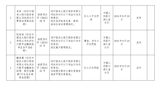 同时,辛某(时任中国光大银行股份有限公司杭州分行零售信贷部总经理)对中国光大银行股份有限公司杭州分行以下违法行为负有责任:违反信用信息采集、提供、查询及相关管理规定,被处5.5万元罚款。