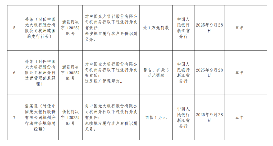 潘某良(时任中国光大银行股份有限公司杭州分行法律合规部总经理)对中国光大银行股份有限公司杭州分行以下违法行为负有责任:未按规定履行客户身份识别义务,被罚款1万元。