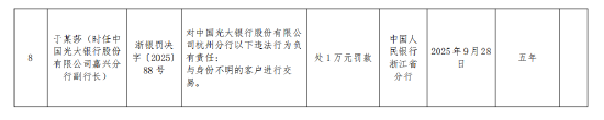 于某莎(时任中国光大银行股份有限公司嘉兴分行副行长)对中国光大银行股份有限公司杭州分行以下违法行为负有责任:与身份不明的客户进行交易,被处1万元罚款。