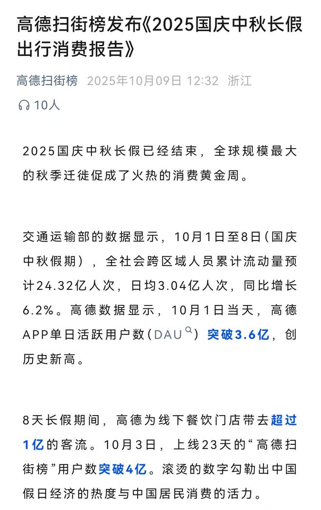 此前的9月10日,高德正式宣布,推出全球首个基于出行行为的榜单产品——高德扫街榜,全面进军本地生活市场。在上线23天后,“高德扫街榜”累计用户数突破4亿(截至10月3日);几乎与此同时,高德App在10月1日录得突破3.6亿的DAU(日活跃用户),创下历史新高。