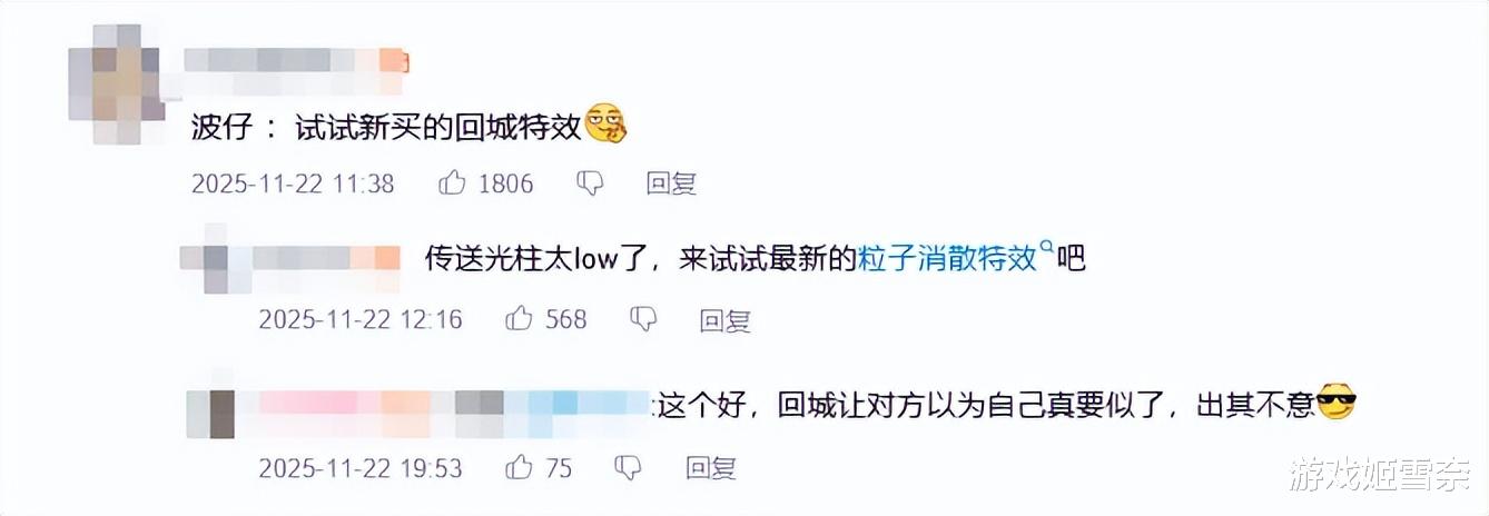 此时的波仔:“家人们试试新买的回城特效,以前传送光柱太LOW了,来试试最新的粒子消散特效吧~”不是哥们,我就说怎么这水豚讲话这么慢的,合着在这块挖坑呢?你家回城特效还带念诗语音包,那买的很值了,放遗言里真没毛病。还有这镜头特写,妥妥致敬的上古老梗“我先一步回英灵殿了”粒子特效都一模一样的,我都能想到策划做出来这玩意不由得轻哼起来的样子。