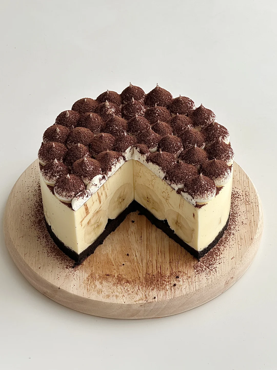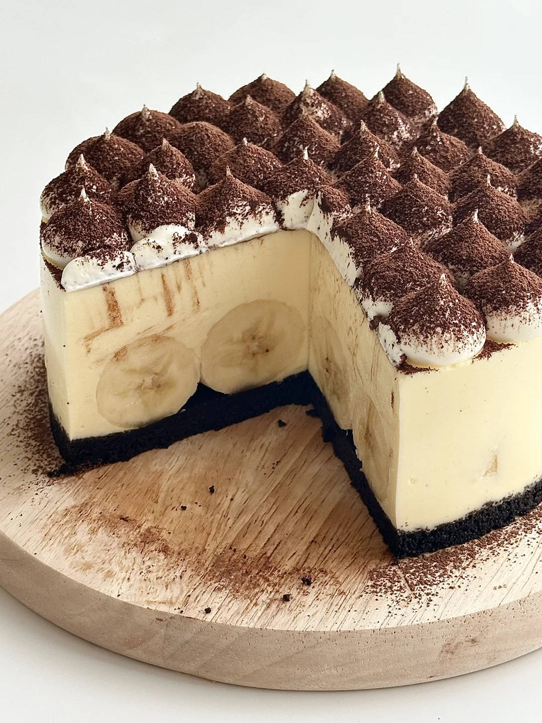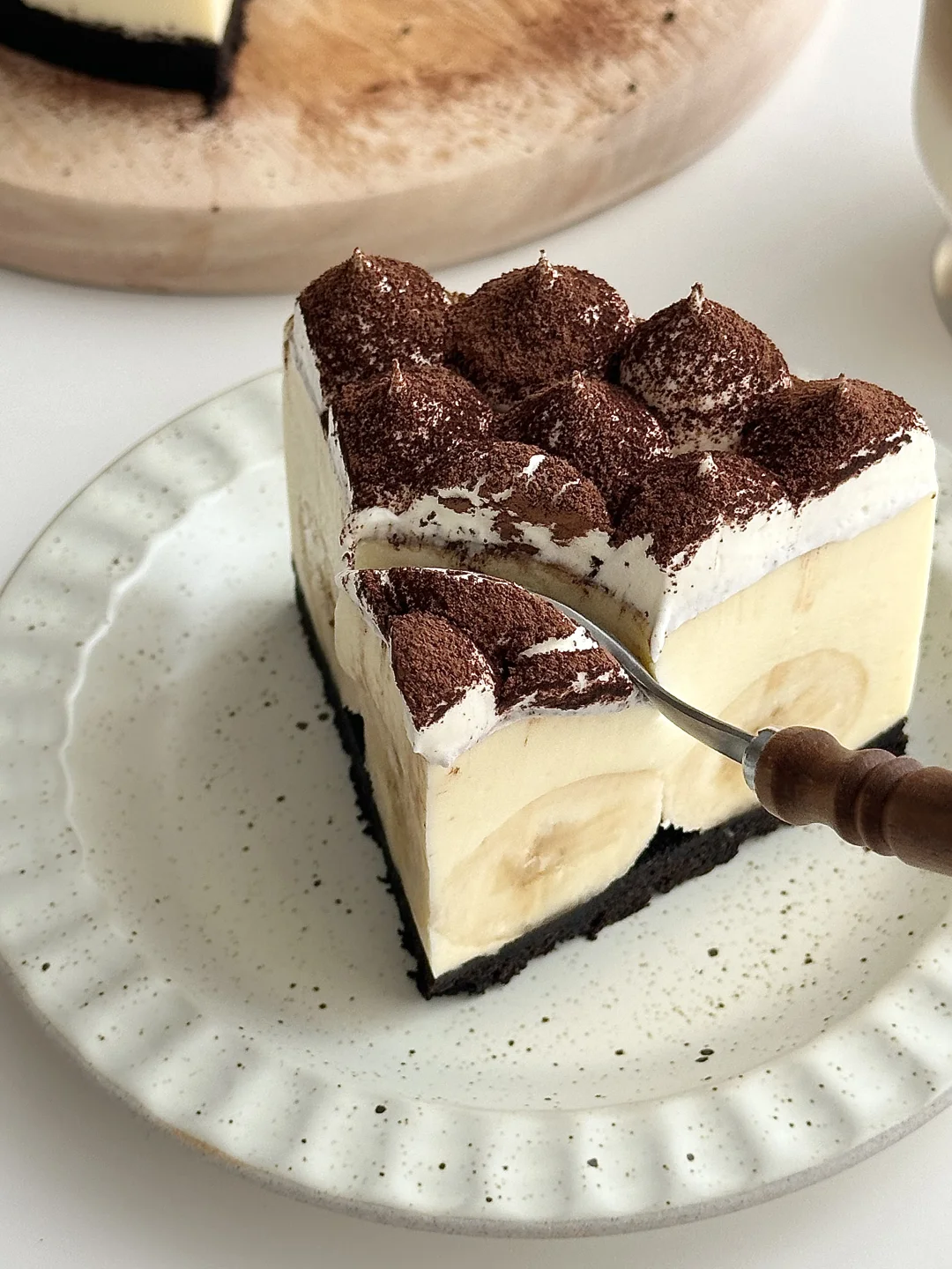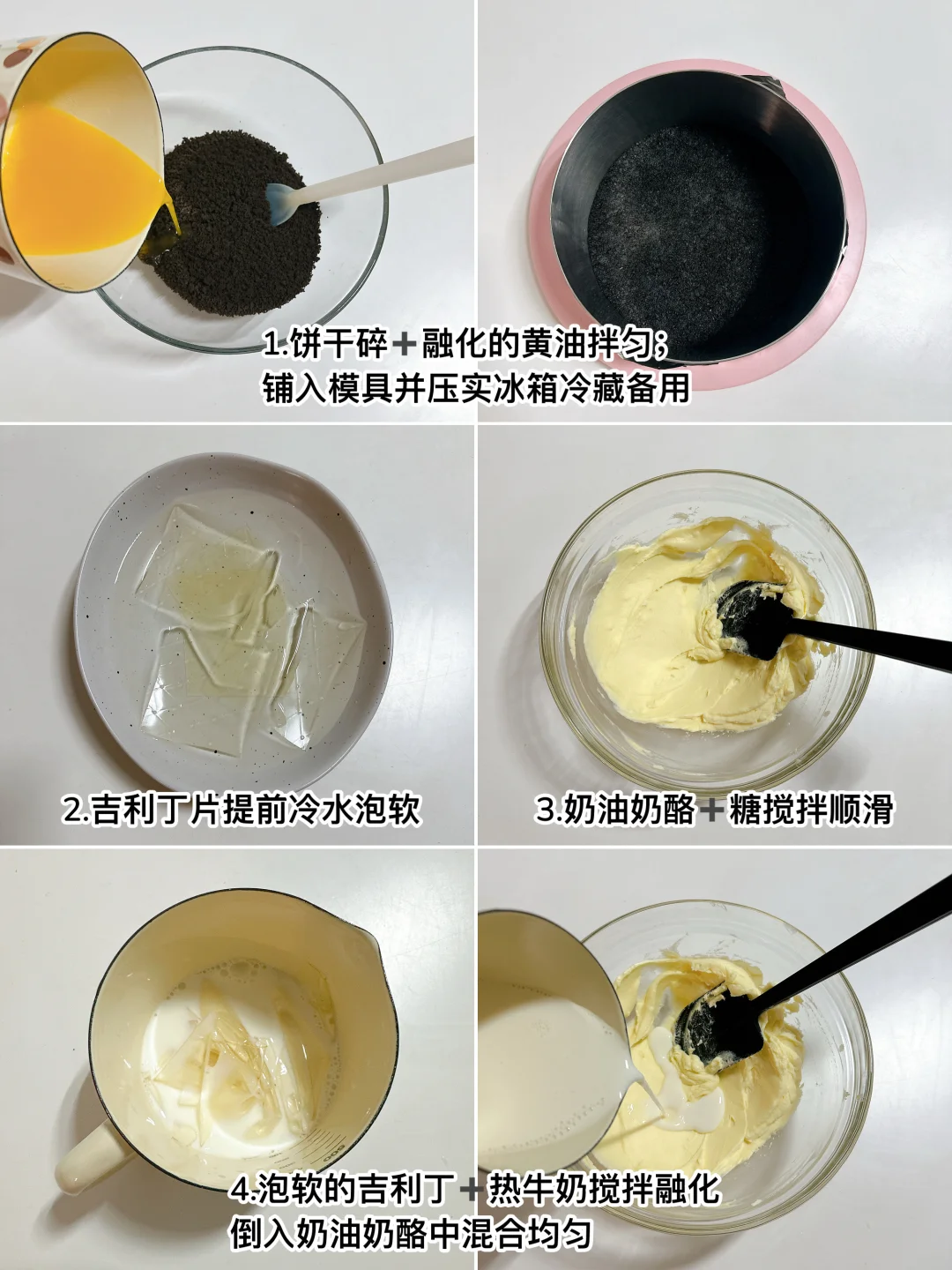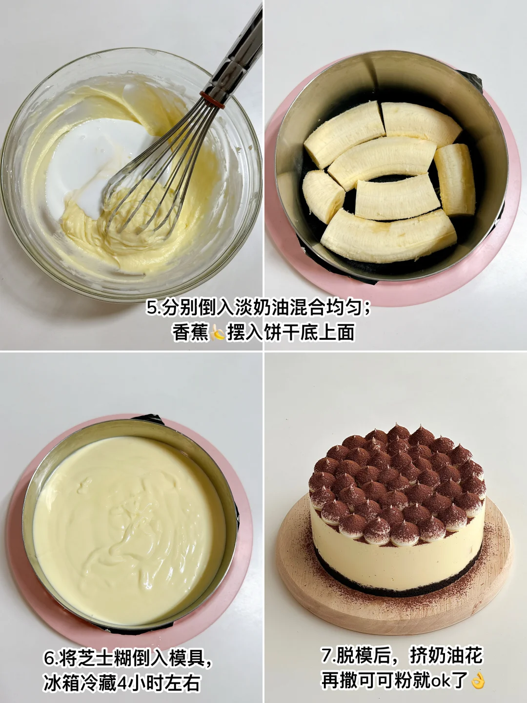 顺滑的芝士带着软糯的香蕉 吃到嘴里只想说太哇塞了[哇R] 做法非常简单 烘焙新手可以从它开始😁 🍌 食材: 饼干碎100g|融化的黄油45g|奶油奶酪220g|糖35g|淡奶油250g|吉利丁片10g|热牛奶 50g|香蕉适量 奶油花:淡奶油80g➕糖7g打发 🧀 做法: ❶饼干碎➕融化的黄油拌匀,铺入模具放冰箱冷藏 ❷奶油奶酪➕糖🥣搅拌顺滑 ❸提前泡好的吉利丁片➕热牛奶搅拌融化,再倒入步骤2的奶酪中混合 ❹倒入淡奶油混合均匀 ❺香蕉摆入饼干底上面,再倒入步骤4的芝士糊,放冰箱冷藏❄️4小时左右脱模 ❻奶油花食材打发挤在蛋糕上,再撒可可粉即可 -