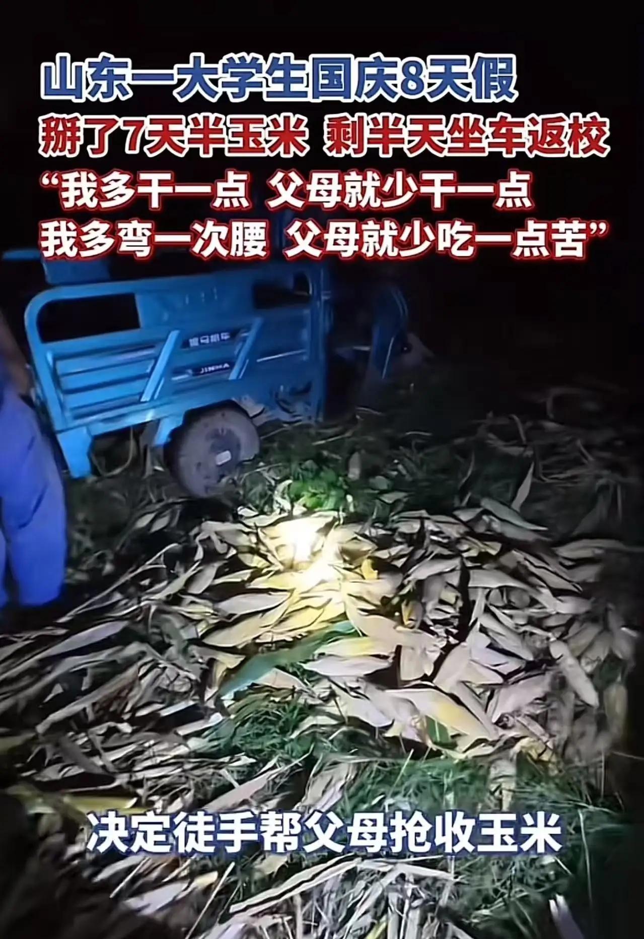 这个山东大学生火了!山东,男孩国庆8天假,掰了7天半玉米,剩半天坐车返校!他说:”,我多干点儿,父母就少干点儿,我多弯一次腰,父母就少吃一点苦!”网友:这样的孩子长大了肯定有担当有责任,肯定会幸福的。父母会少了很多辛苦! 这位山东的男孩,凭借一份朴实的善良和责任感,瞬间点燃了无数人的心。这不仅仅是一段简单的假期故事,更像是一面镜子,照出了许多家庭、社会、甚至我们每个人内心深处的温暖与责任。 你是否曾在繁忙的生活中,忽略了父母那一份默默的付出?你是否也曾在压力和责任中,渴望能为父母减轻一点点负担?这个男孩用行动告诉我们:责任从来不是空洞的口号,而是点点滴滴的细节,是用心去体会、去付出。或许,他只是一名普通的学生,但他的行为,却折射出一种大爱的光芒。 有人说,这样的孩子长大了,必定会有担当、有责任感,未来一定会幸福。这话不无道理。责任感,是一个人最宝贵的品质。它不是天生的,而是在家庭的熏陶中逐渐培养起来的。这个男孩用自己的行动,向我们展示了家庭教育的力量,也让我们反思:我们是否在不经意间,忽略了对孩子责任感的培养?是否在忙碌中,忘记了那些最质朴的价值观? 他掰玉米的画面,也许看似简单,但背后却藏着深刻的家庭温情。那半天的返校路上,他或许在想:我多干点儿,父母就少干点儿;我多弯一次腰,父母就少吃一点苦。这种想法,折射出一种纯粹的孝心和责任感。这不只是一个学生的行为,更是一种对家庭、对生活的深刻理解。 在这个快节奏、充满压力的时代,我们是否也应该学会像他一样,用行动去表达关爱?或许,我们可以从身边的小事做起:为父母倒一杯水,帮他们分担一些琐事,或者用一句温暖的话语,让他们感受到我们的在乎。因为,真正的幸福,不在于物质的丰富,而在于心与心的连接。 这个男孩的故事,也引发了网友们的热议。有的人感慨:这样的孩子,未来一定有出息;有的人则反思:我们是不是也该从自己做起,重新审视家庭的责任与爱。无论怎样,这个故事都在提醒我们:责任感,是一份最珍贵的财富;孝心,是一份最真挚的情感。 或许,正是这些普通而又不平凡的瞬间,构筑了我们这个社会最坚实的基石。每一个愿意为家庭付出、愿意用行动表达爱的孩子,都是未来的希望。让我们为这个山东男孩点赞,也为自己心中的责任感鼓掌。 因为,责任与爱,从不复杂,它们就在我们每一个人的点滴行动中。只要我们愿意,从今天开始,做那个“多干点儿,少吃点苦”的人,让爱与责任成为我们最美的风景线。这样,我们的家庭会更温暖,社会会更和谐,未来也会更加光明。 责任,从点滴做起;爱,从行动开始。这,或许就是我们每个人都应该铭记的生活真谛。大学生回村干活